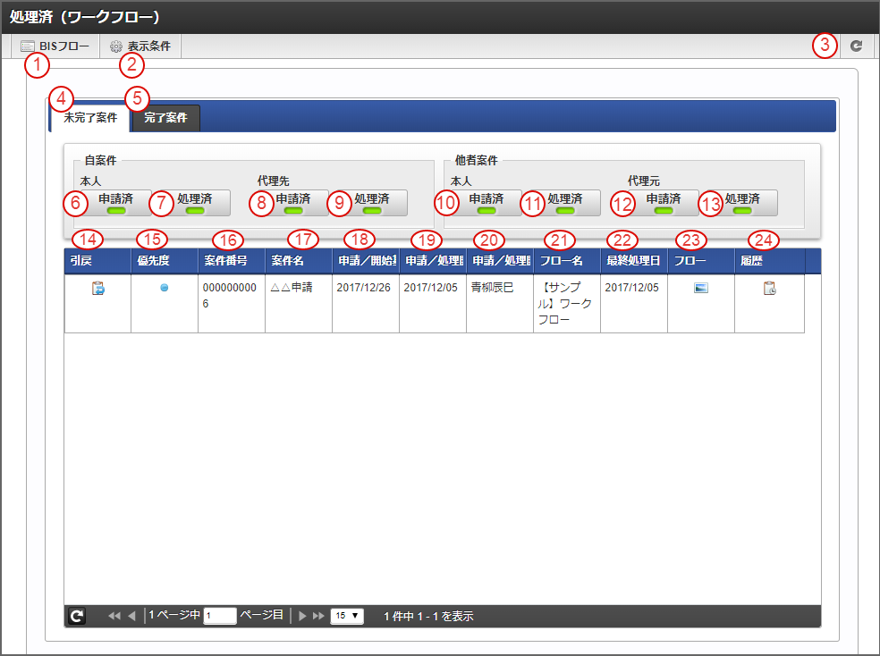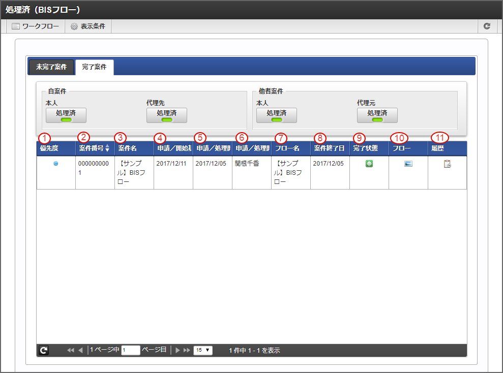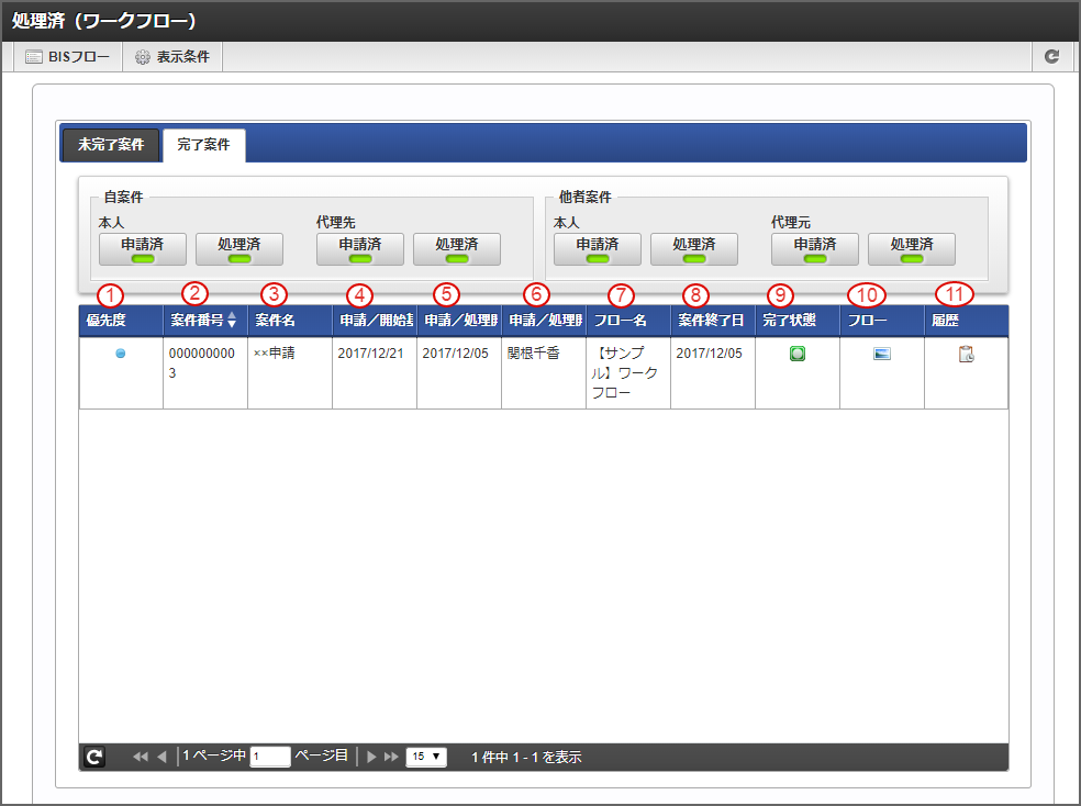 「処理済(BISフロー)」画面の「完了案件」¶
