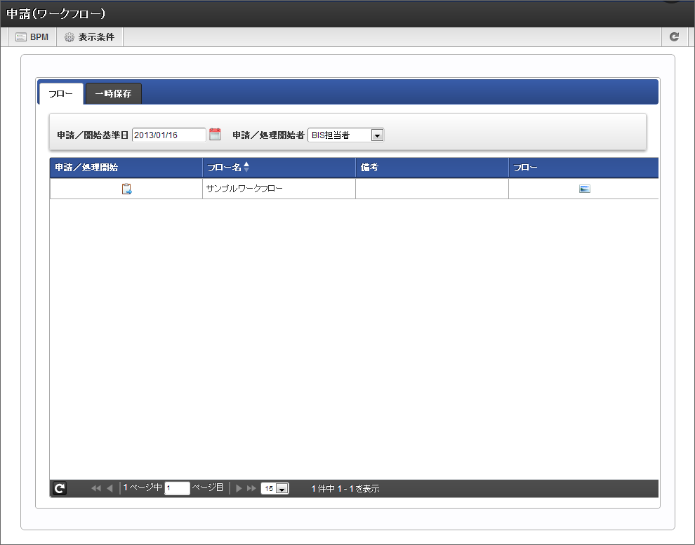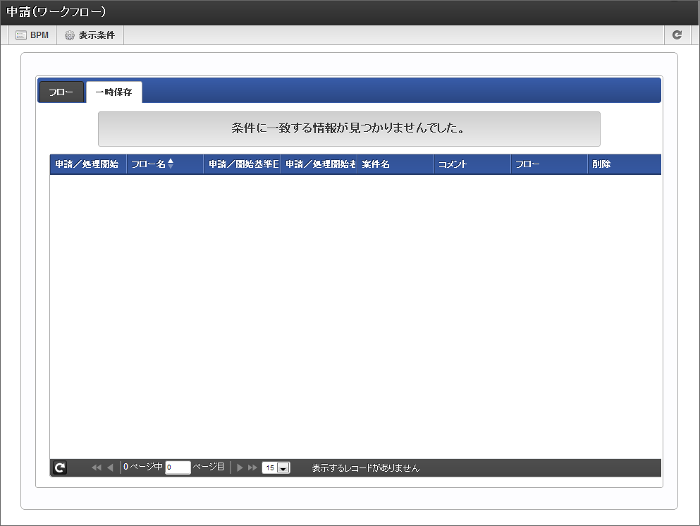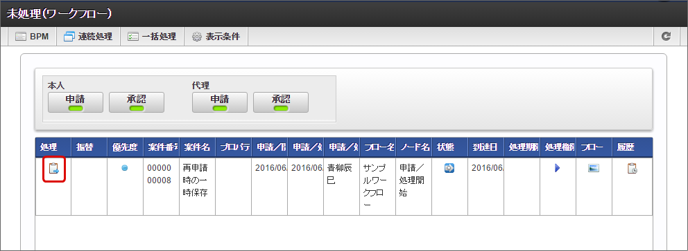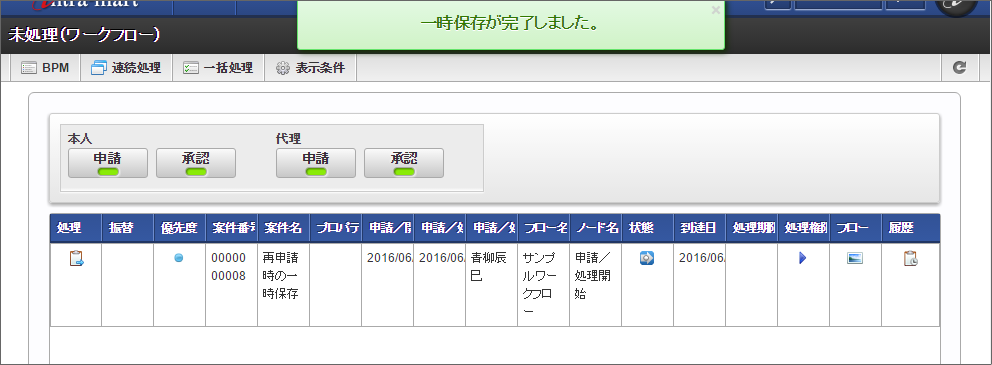未処理の一覧から対象の案件の「処理」をクリックします。 必要な情報を入力し、「一時保存」をクリックします。 確認のメッセージが表示されたら「決定」をクリックします。 正常に一時保存が行われると、「未処理(ワークフロー)」画面に戻ります。