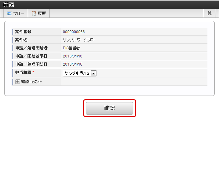 フロー上の確認ノードで確認対象者となっているユーザが、案件の処理状況を確認します。 確認ノードが接続しているノードの処理が完了した時点で、確認できます。 確認画面で一覧表示されている確認案件に対して操作します。 「サイトマップ」→「IM-BIS」→「ワークフロー」→「確認」をクリックします。 確認したい案件の、 をクリックします。 「承認」をクリックします。 「確認」をクリックします。 確認ダイアログが表示されたら「決定」をクリックします。 案件の確認ができました。