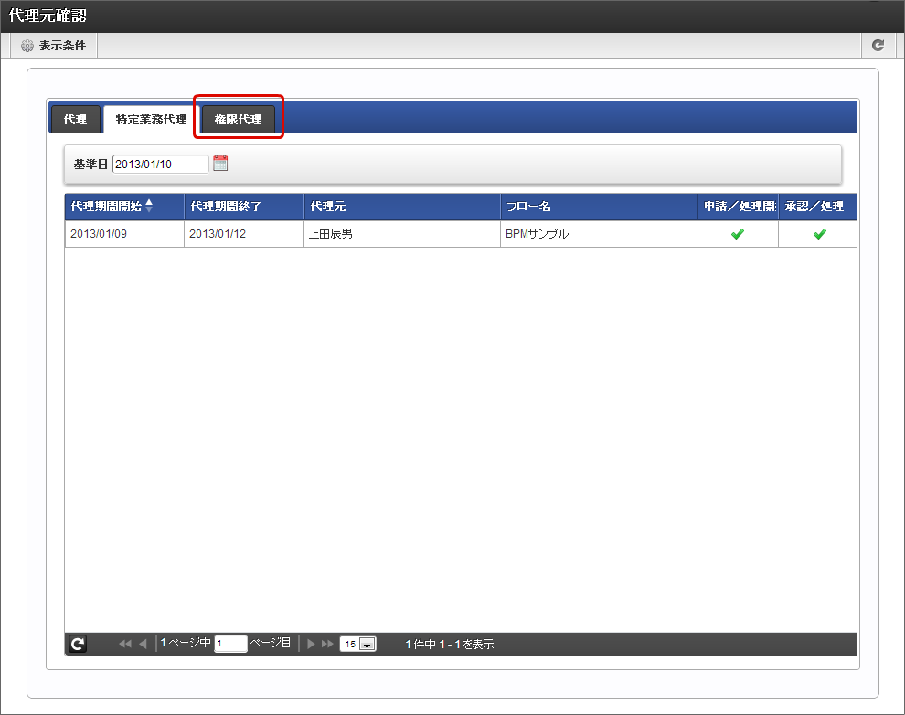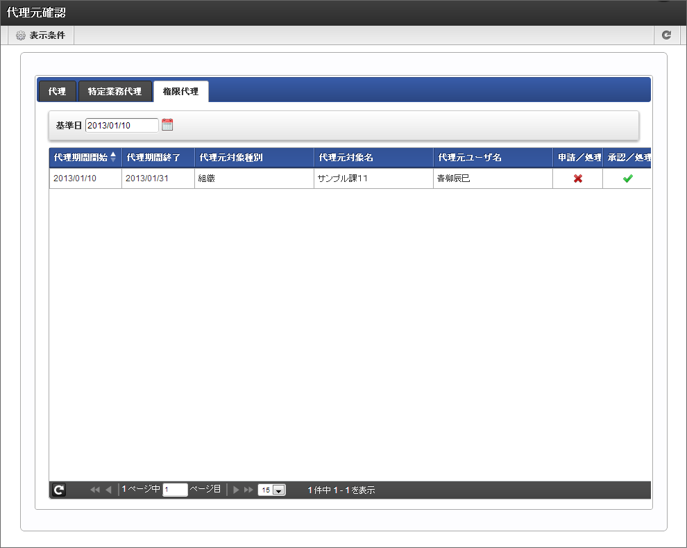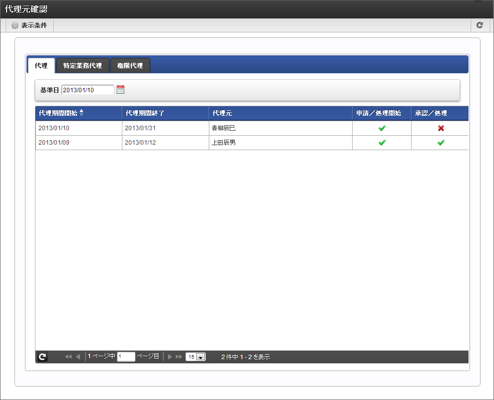 代理元確認では、他のユーザの申請(承認)/処理の代理処理者として利用者が設定されている内容の確認をすることができます。
