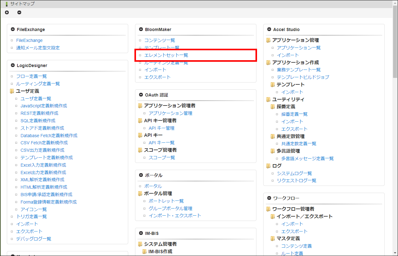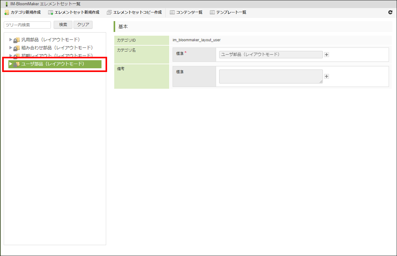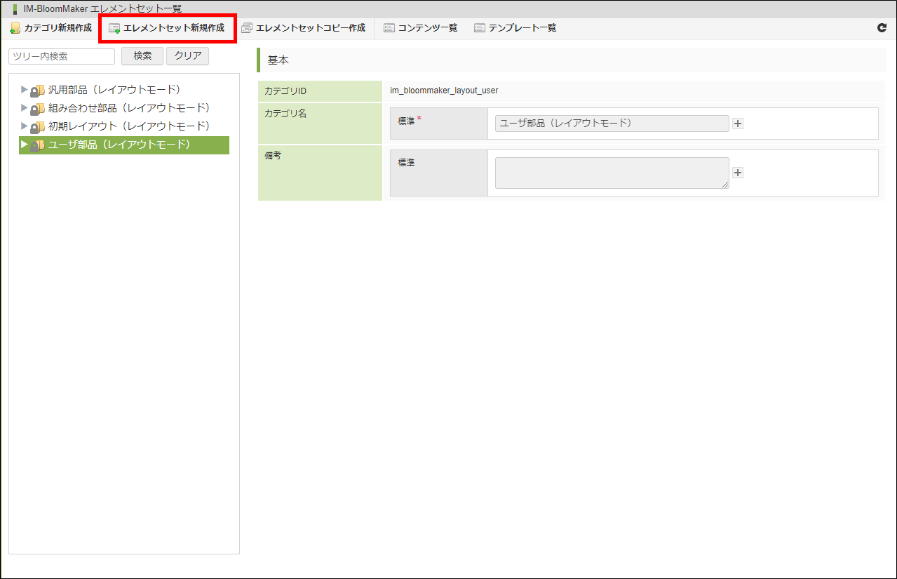 「サイトマップ」→「BloomMaker」→「エレメントセット一覧」から、「エレメントセット一覧」画面を開きます。エレメントセットカテゴリから「ユーザ部品(レイアウトモード)」を選択します。