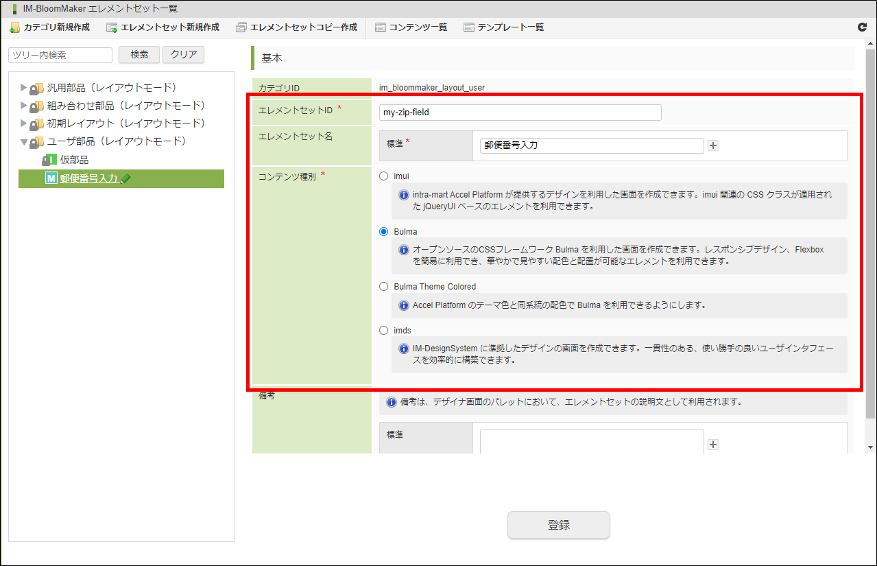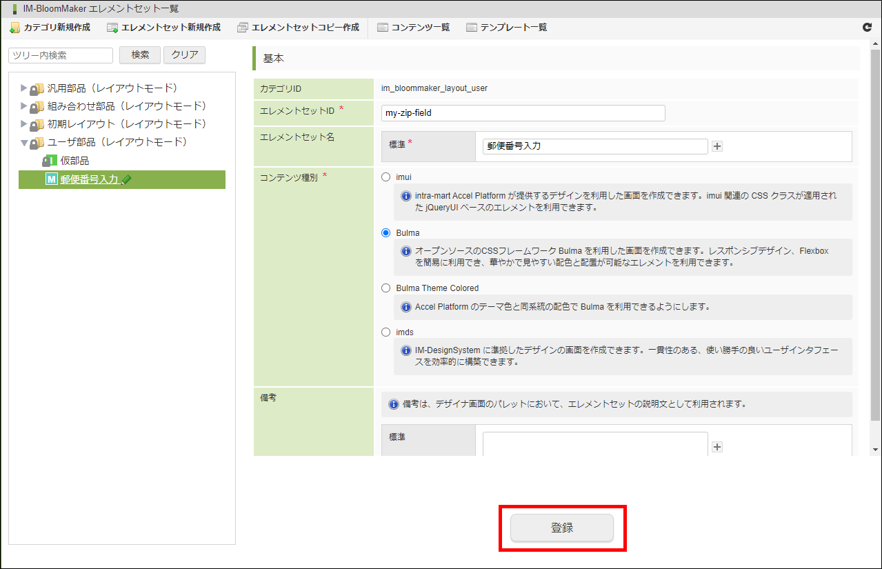 図:エレメントセット情報「登録」をクリックします。