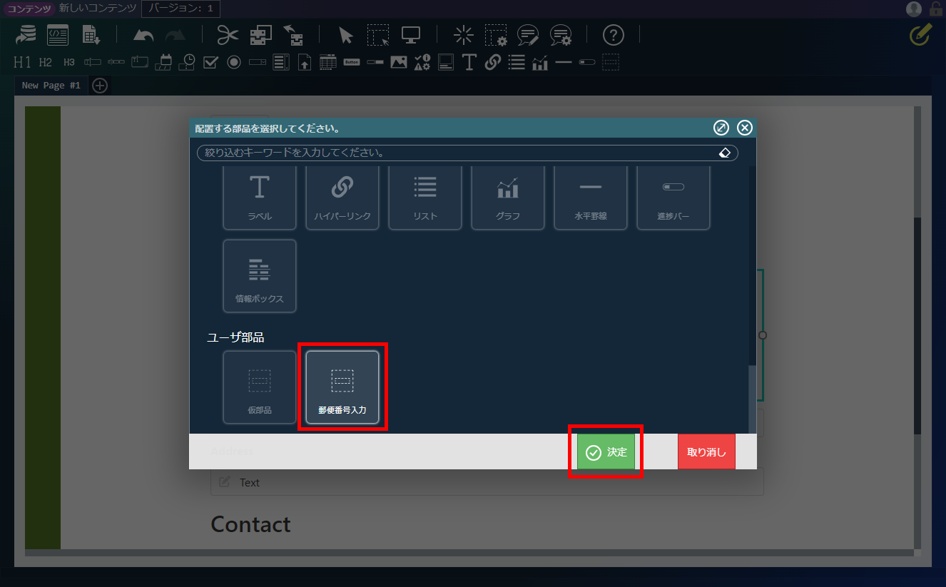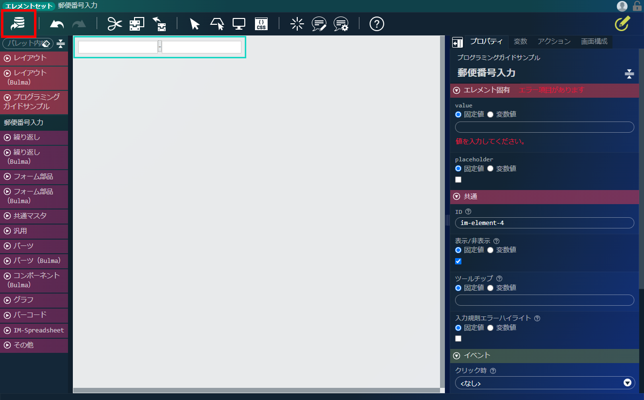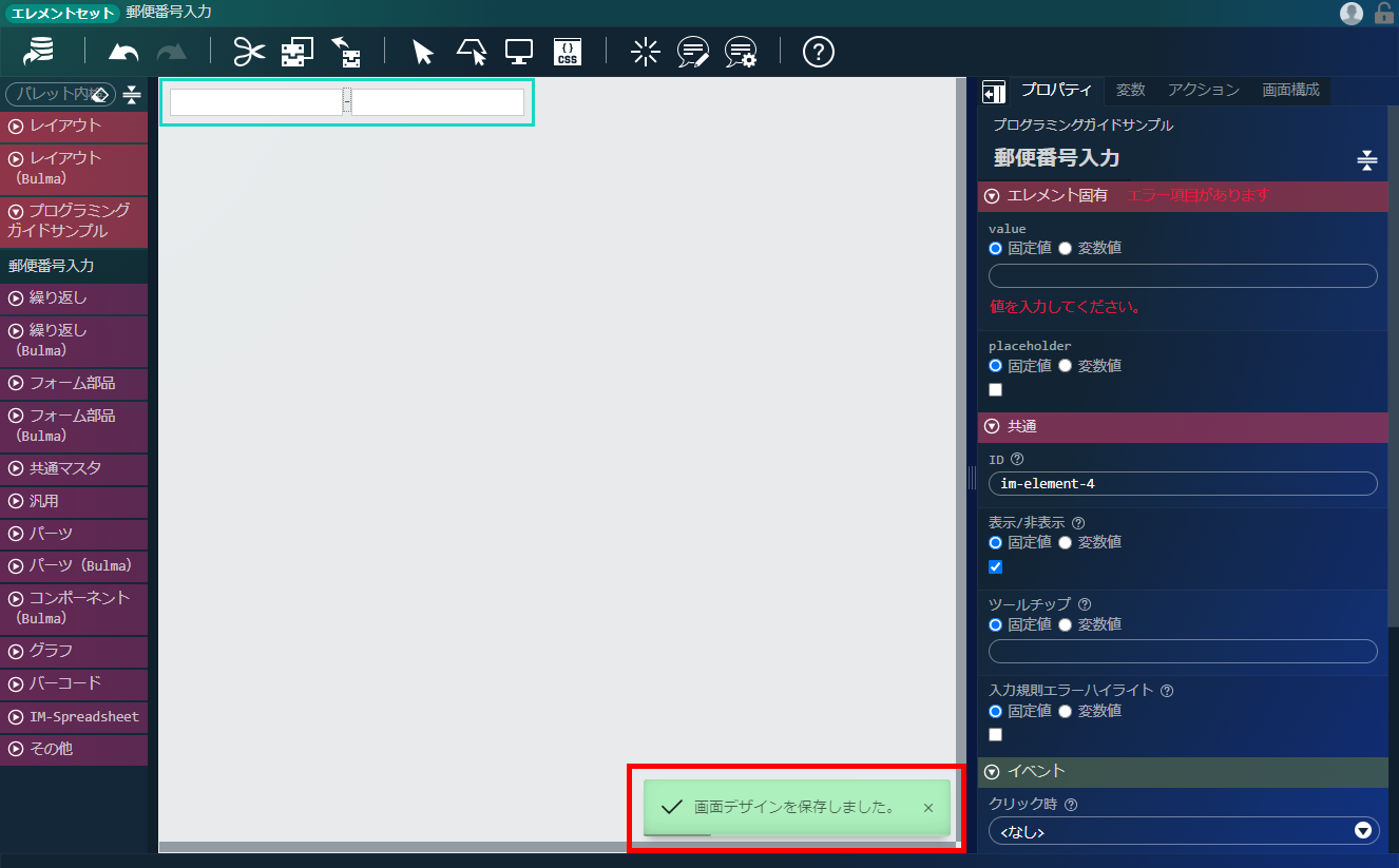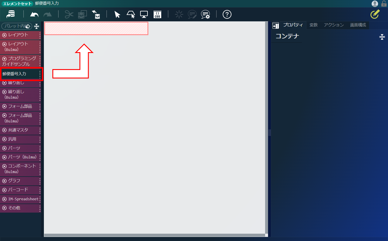 エレメントパレットから、「プログラミングガイドサンプル」-「郵便番号入力」をコンテナにドラッグ&ドロップします。「デザイナ」画面上部、ヘッダ内の「上書き保存」アイコンをクリックします。
