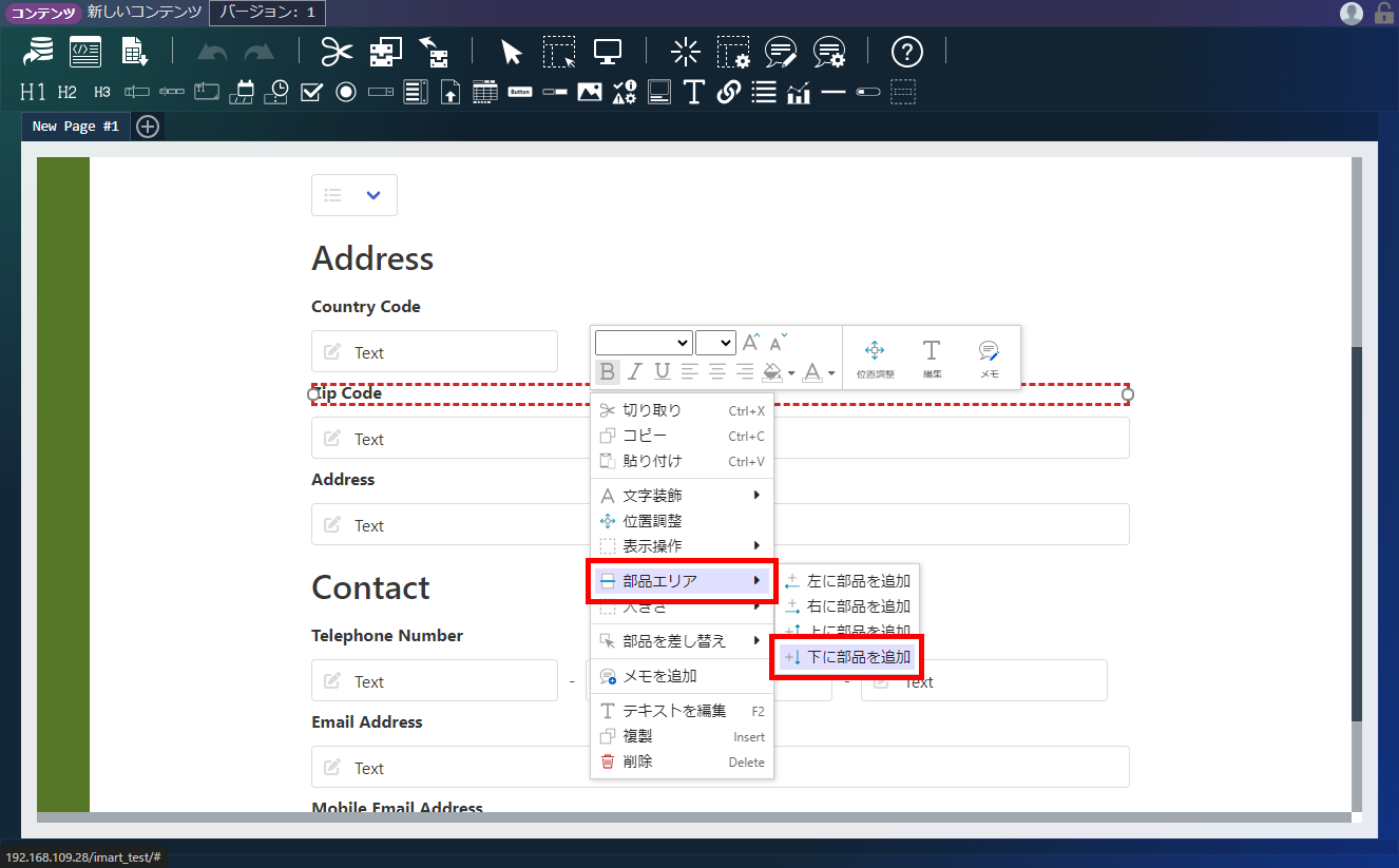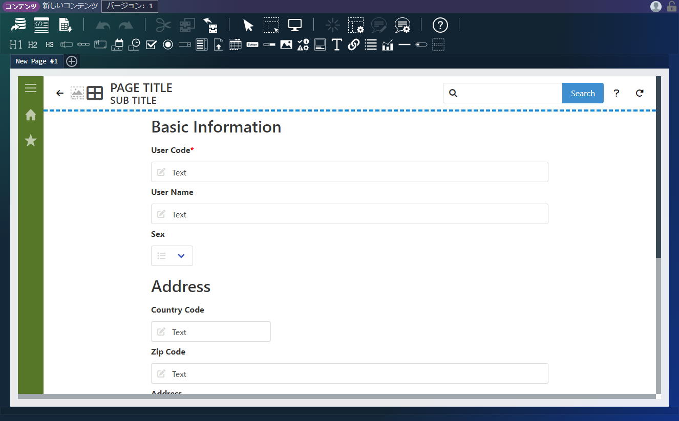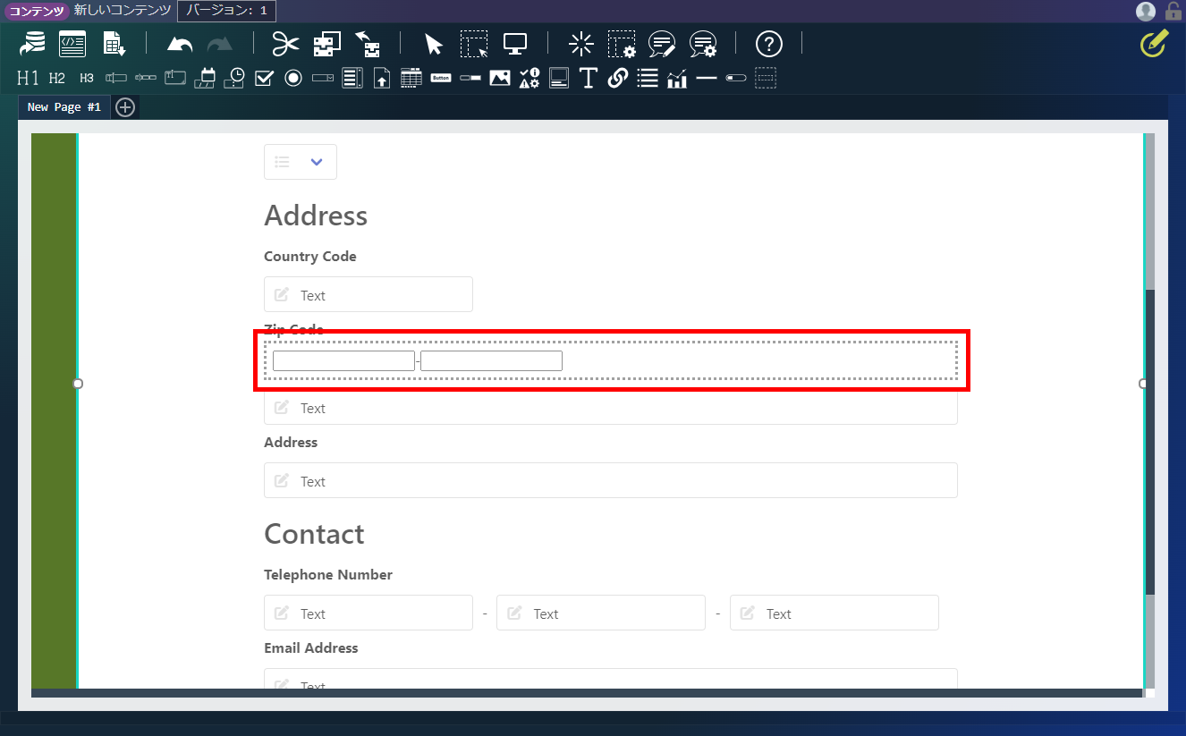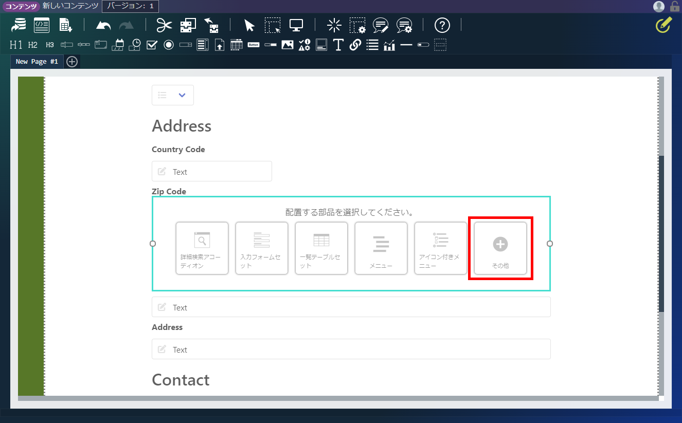 エレメントパレットから、「プログラミングガイドサンプル」-「郵便番号入力」をコンテナにドラッグ&ドロップします。「デザイナ」画面上部、ヘッダ内の「上書き保存」アイコンをクリックします。