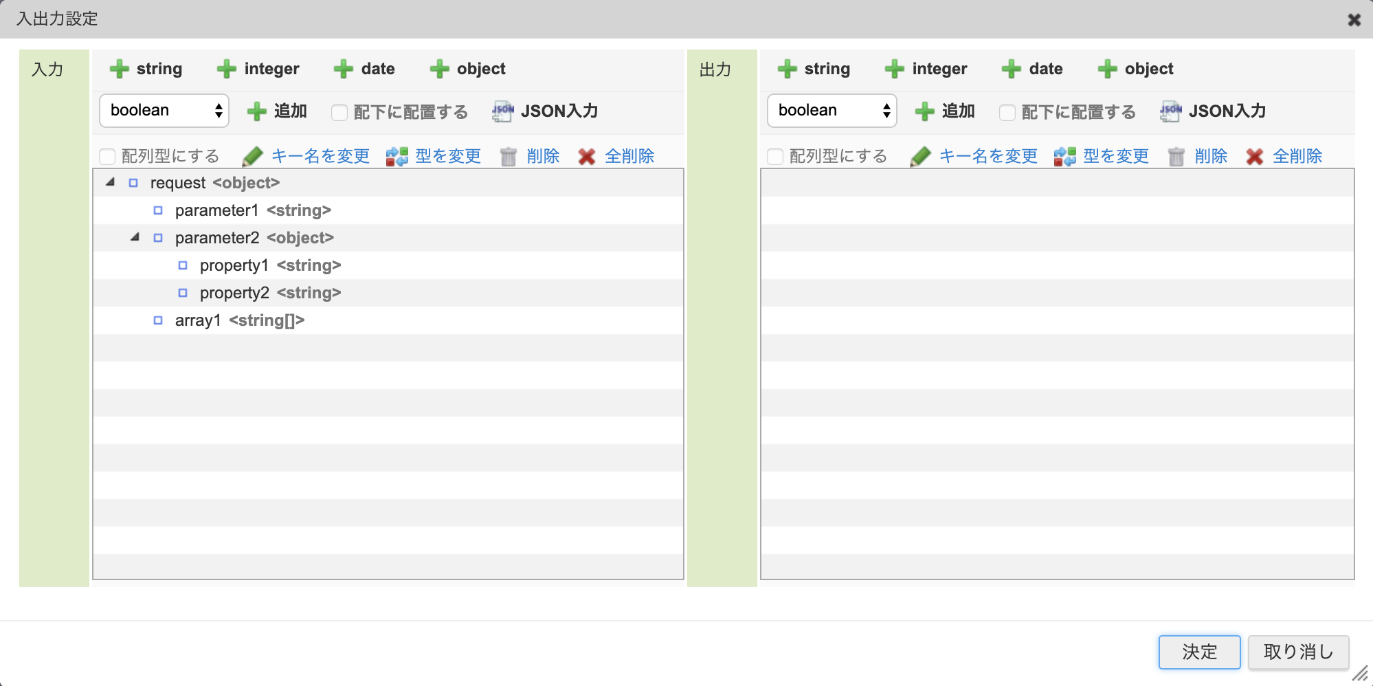 型が object のものは、 リクエストパラメータの解析 のフロー定義のように必要なプロパティを定義します。