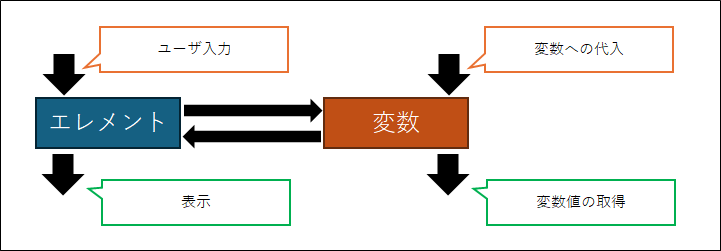 このエレメントと変数が同期する動作を「双方向バインディング」と呼び、IM-BloomMaker ではエレメントの操作をすべて変数を経由して行います。この仕組みを利用することで以下のようなメリットがあります。