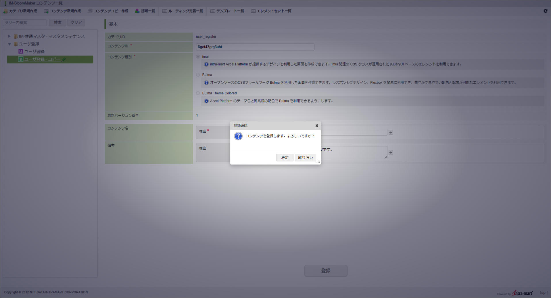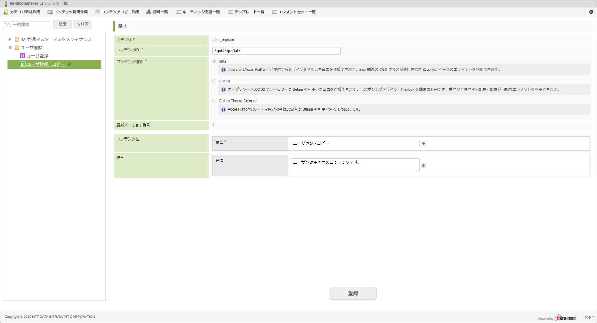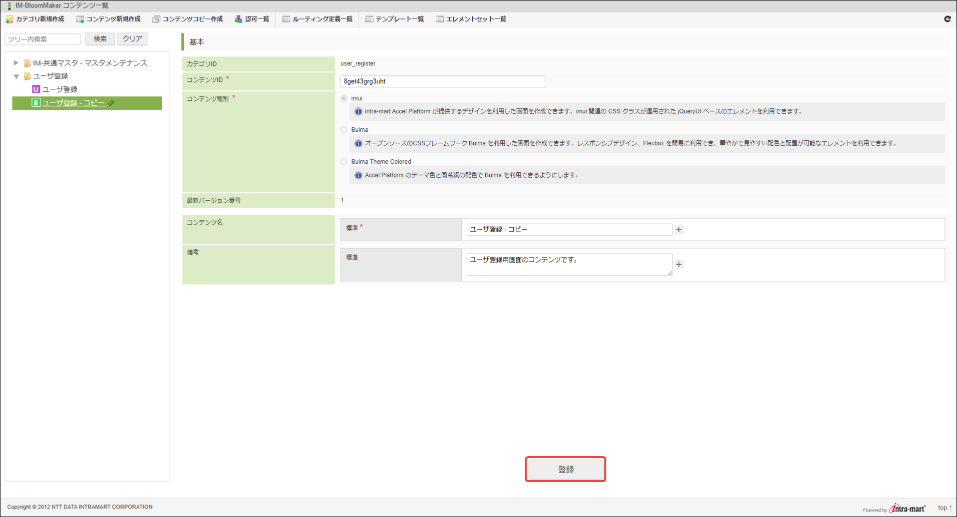 「コンテンツ種別」は Bulma または Bulma Theme Colored を利用時のみ、Bulma と Bulma Theme Colored 間で変更が可能です。それ以外のコンテンツ種別の場合、変更はできません。「登録」をクリックします。