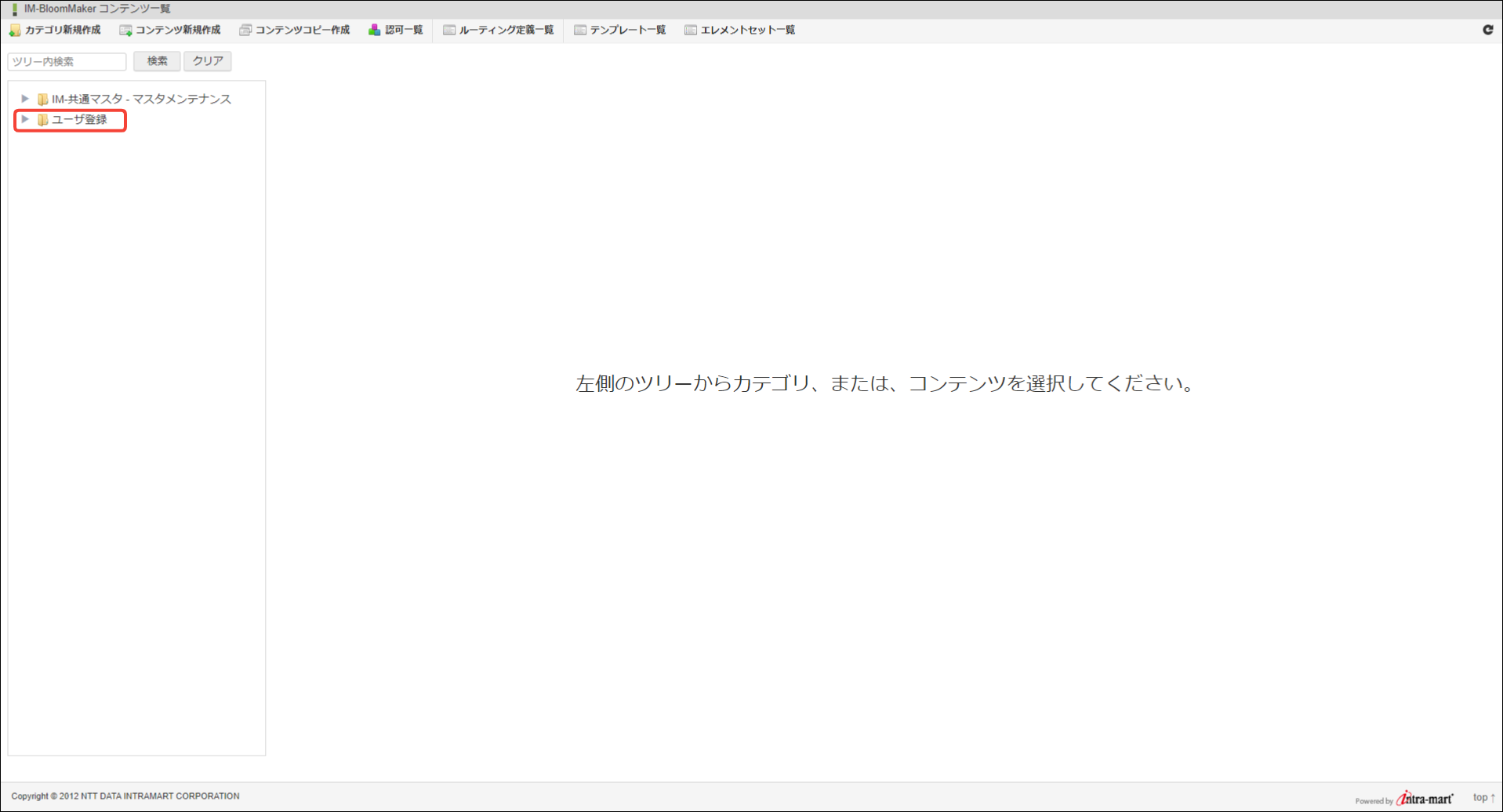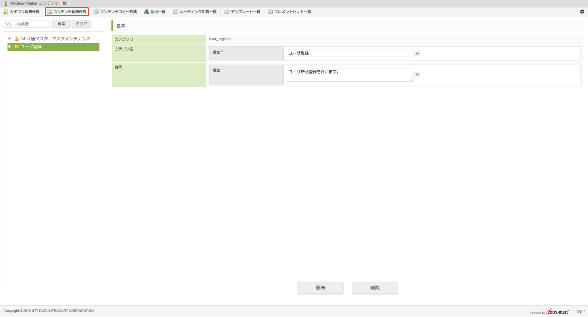 新規コンテンツを追加するカテゴリをコンテンツツリーから選択してクリックします。