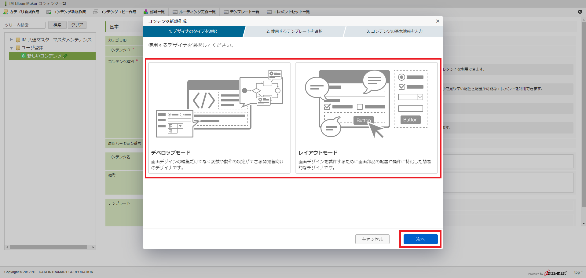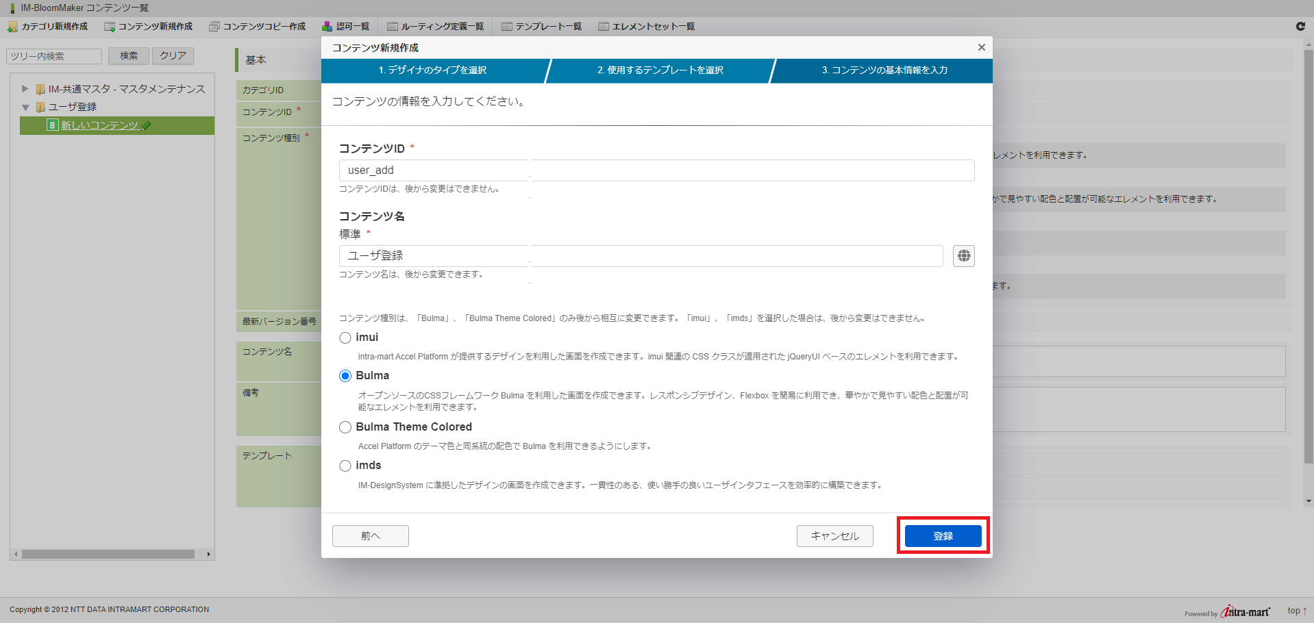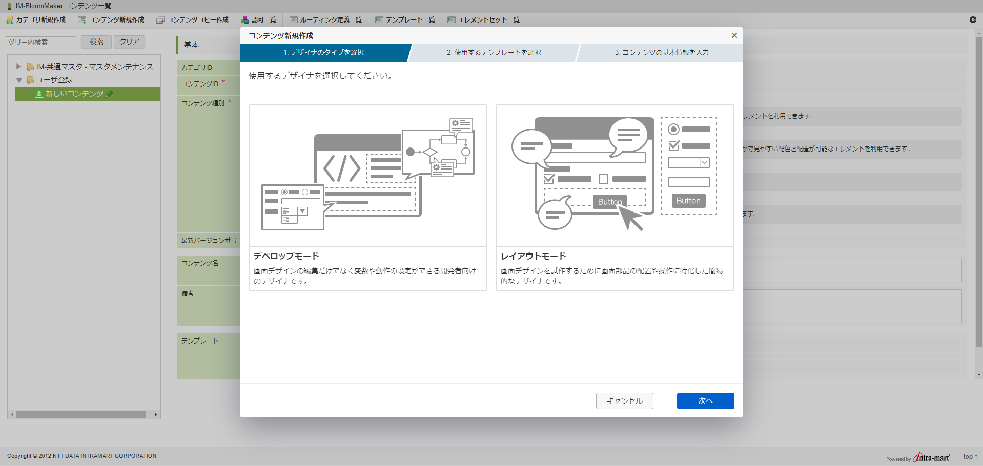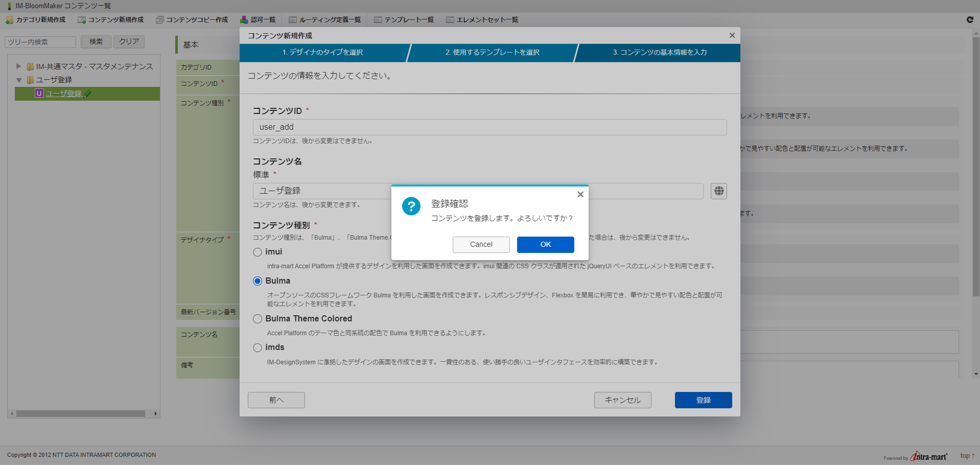 デザイナ選択で「レイアウトモード」を選択した場合、コンテンツ種別で「imui」は選択できません。「OK」をクリックすると入力内容を登録します。「Cancel」をクリックすると入力画面に戻ります。