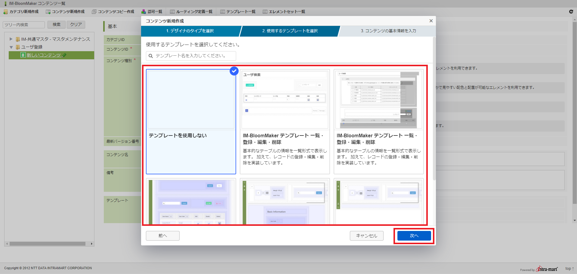 使用するテンプレートを選択し、「次へ」をクリックします。