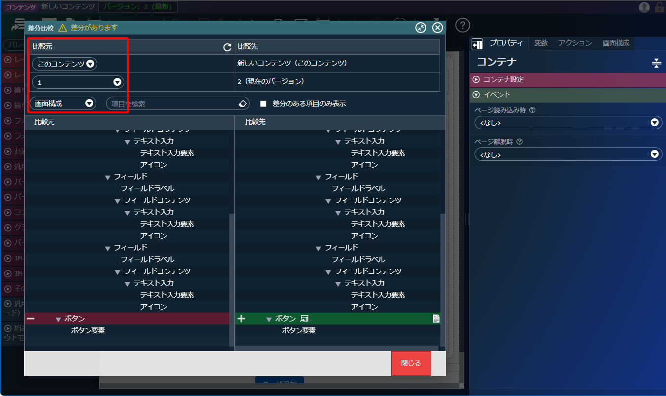 比較したいコンテンツやバージョン番号、項目を選択します。