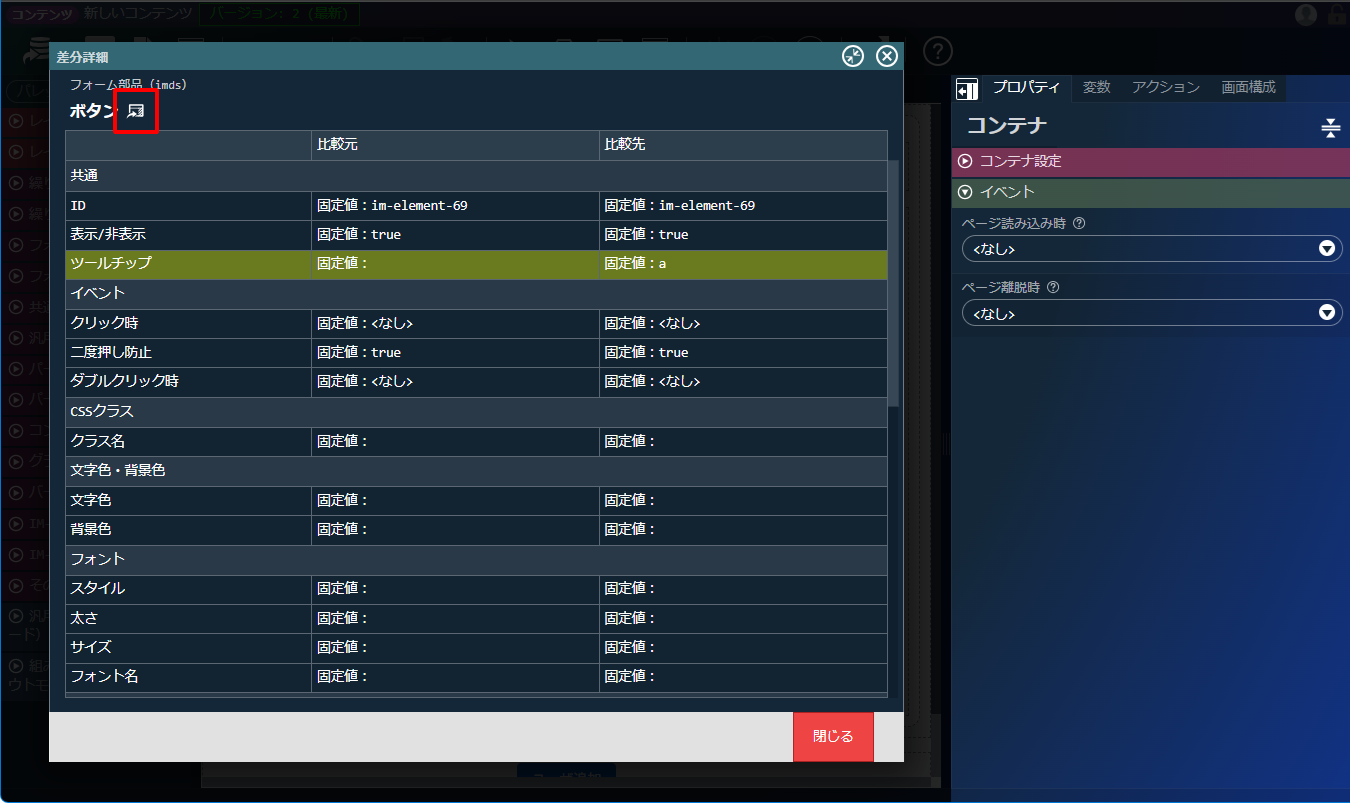ヘッダの「差分比較」アイコンをクリックします。