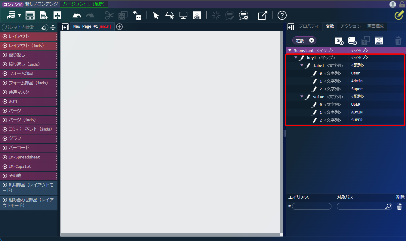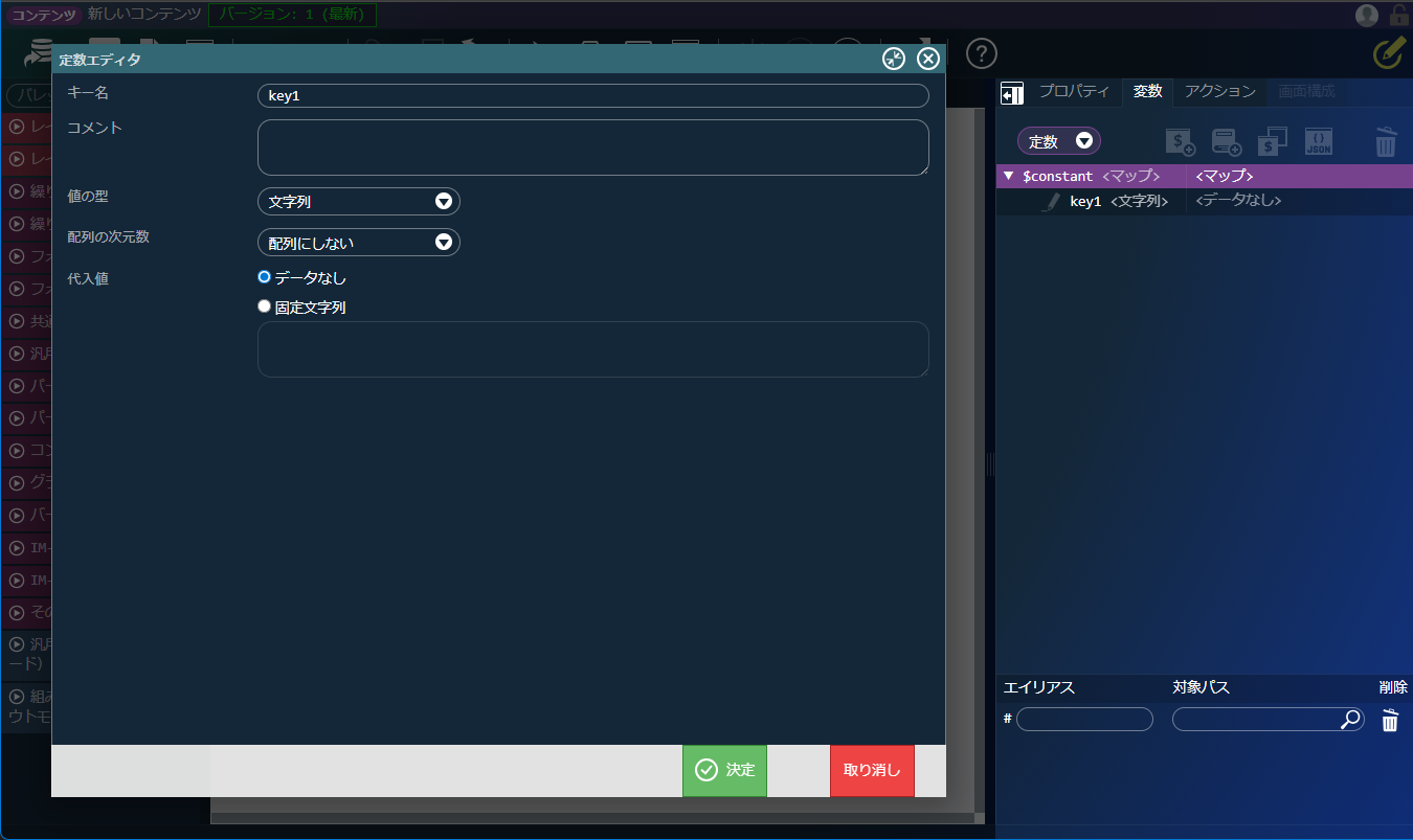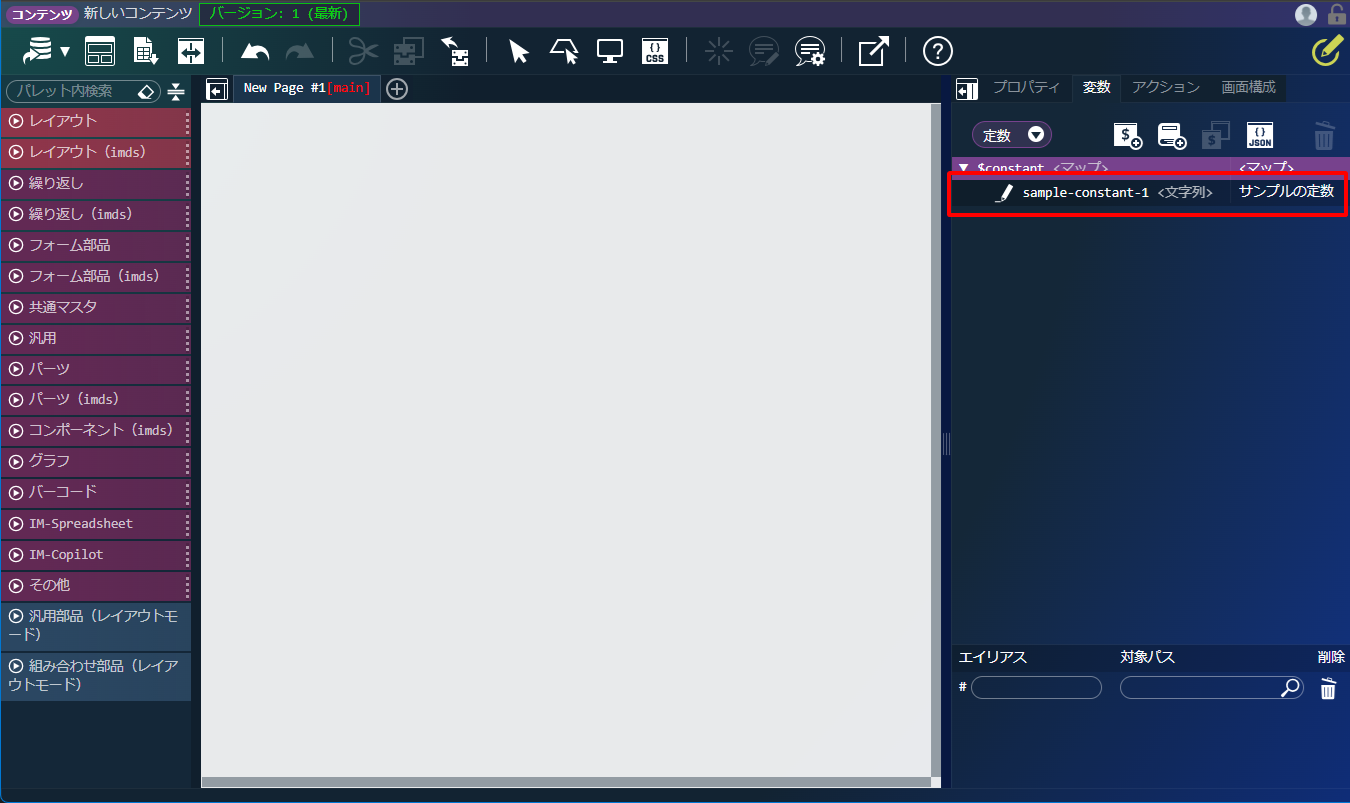 以降は通常の定数と同じように、エレメントへ指定したり、カスタムスクリプトで $constant.sample-constant-1 のように参照できます。