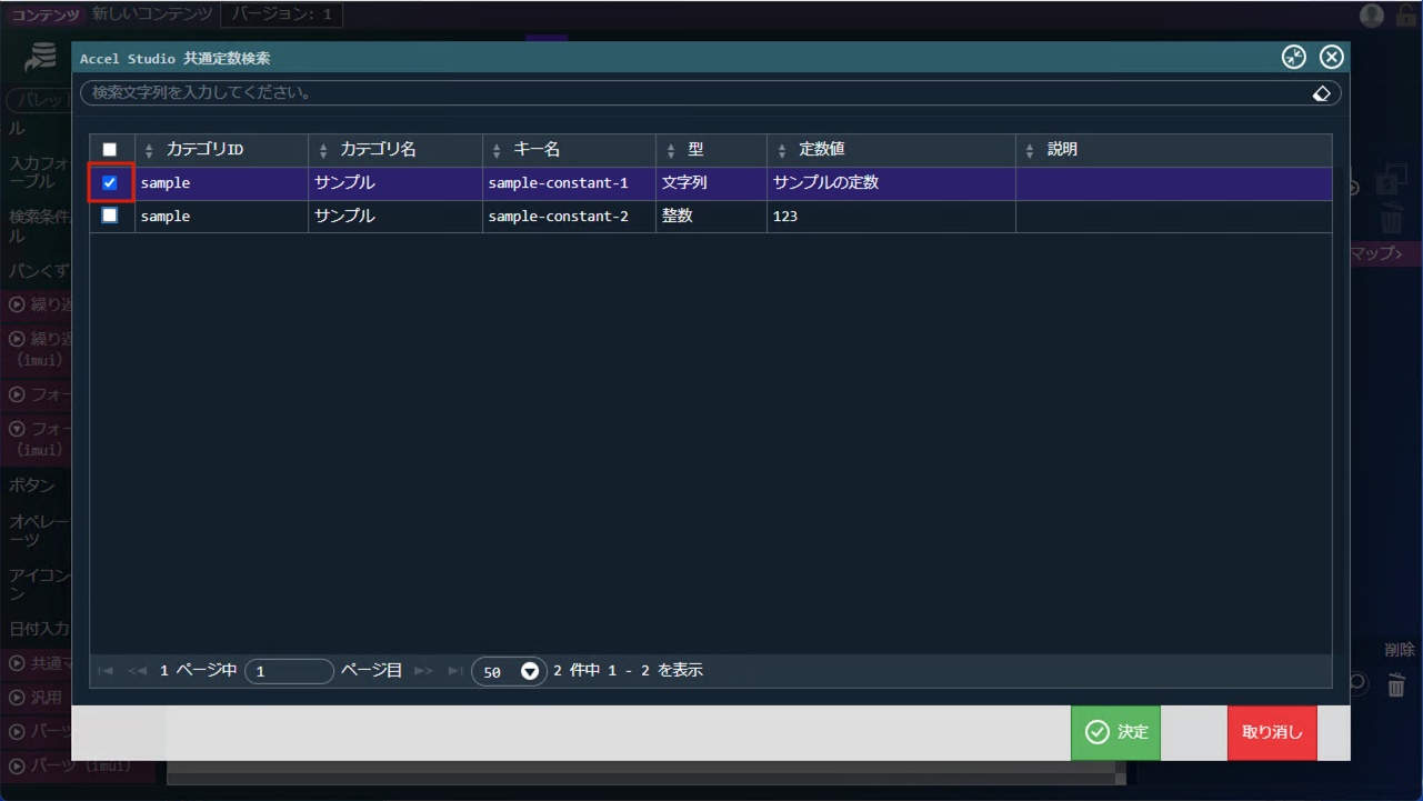 「Accel Studio 共通定数検索」ダイアログで、取り込みたい共通定数を選択し、「決定」ボタンをクリックします。