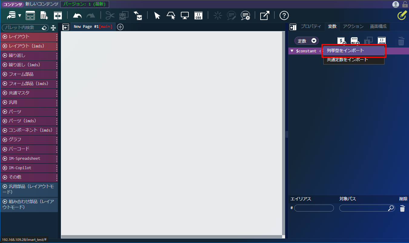 - IM-Repository の定義から変数を作成する場合は、「サイトマップ」→「Repository」→「列挙型一覧」であらかじめ定義を登録しておくことが必要です。