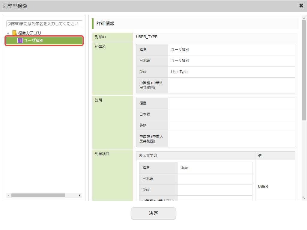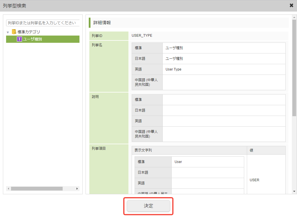 - 列挙型検索ダイアログで選択した列挙型において、「標準」以外の言語で「表示文字列」が登録されている場合、自動的に「多言語」変数へのリンクが作成されます。 作成された「多言語」変数を表示する場合は、「多言語の設定方法」を参照してください。