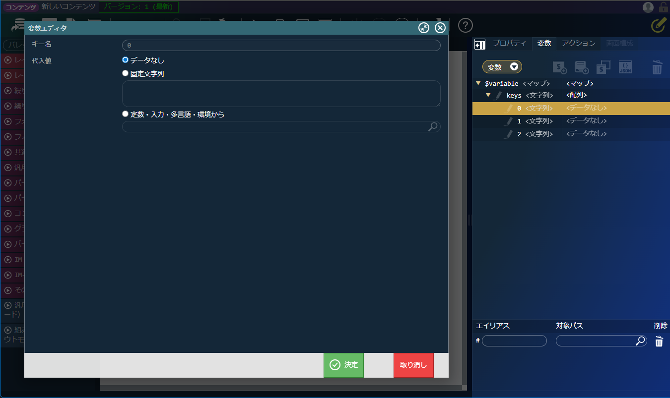 配列の型 代入値 入力方法 文字列 固定文字列 設定内容をテキストボックスへ直接入力 整数 固定数値 設定内容をテキストボックスへ直接入力 浮動小数点数 固定数値 設定内容をテキストボックスへ直接入力 高精度小数 固定数値 設定内容をテキストボックスへ直接入力 真偽値 はい・いいえ 値「true」を設定したい場合は「はい」、値「false」を設定したい場合は「いいえ」を選択 日付・時刻 固定日時 テキストボックスの記載例を参考に日付・時間を入力 マップ マップ -