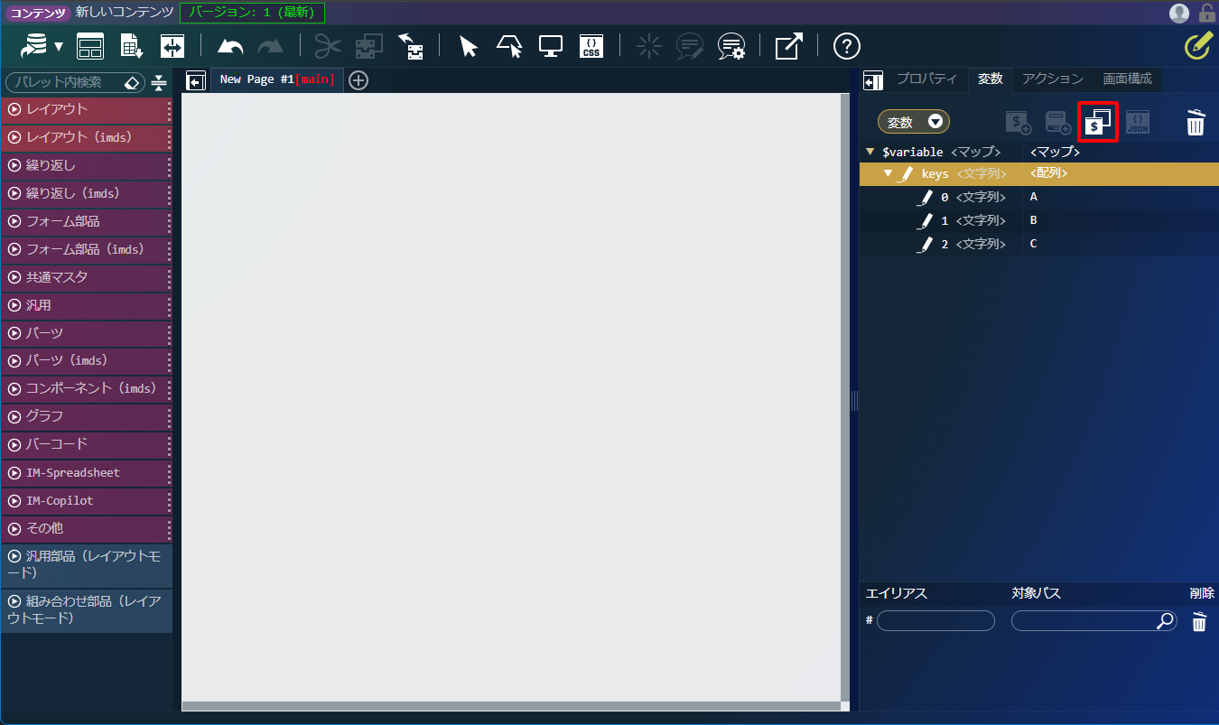 変数の設定前に「コンテナ」内に「エレメント」を配置してください。 配置方法は「アプリケーション画面で利用するエレメントを配置する」を参照してください。