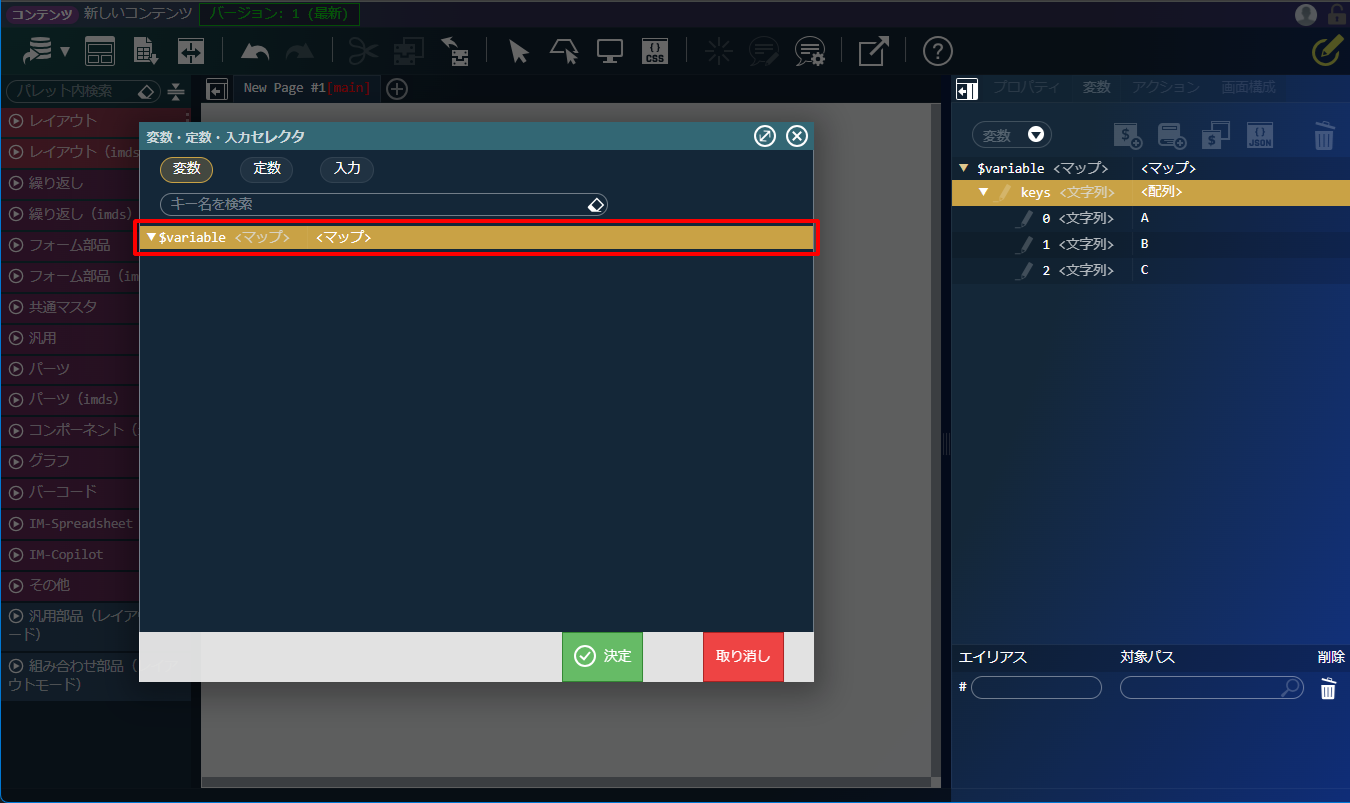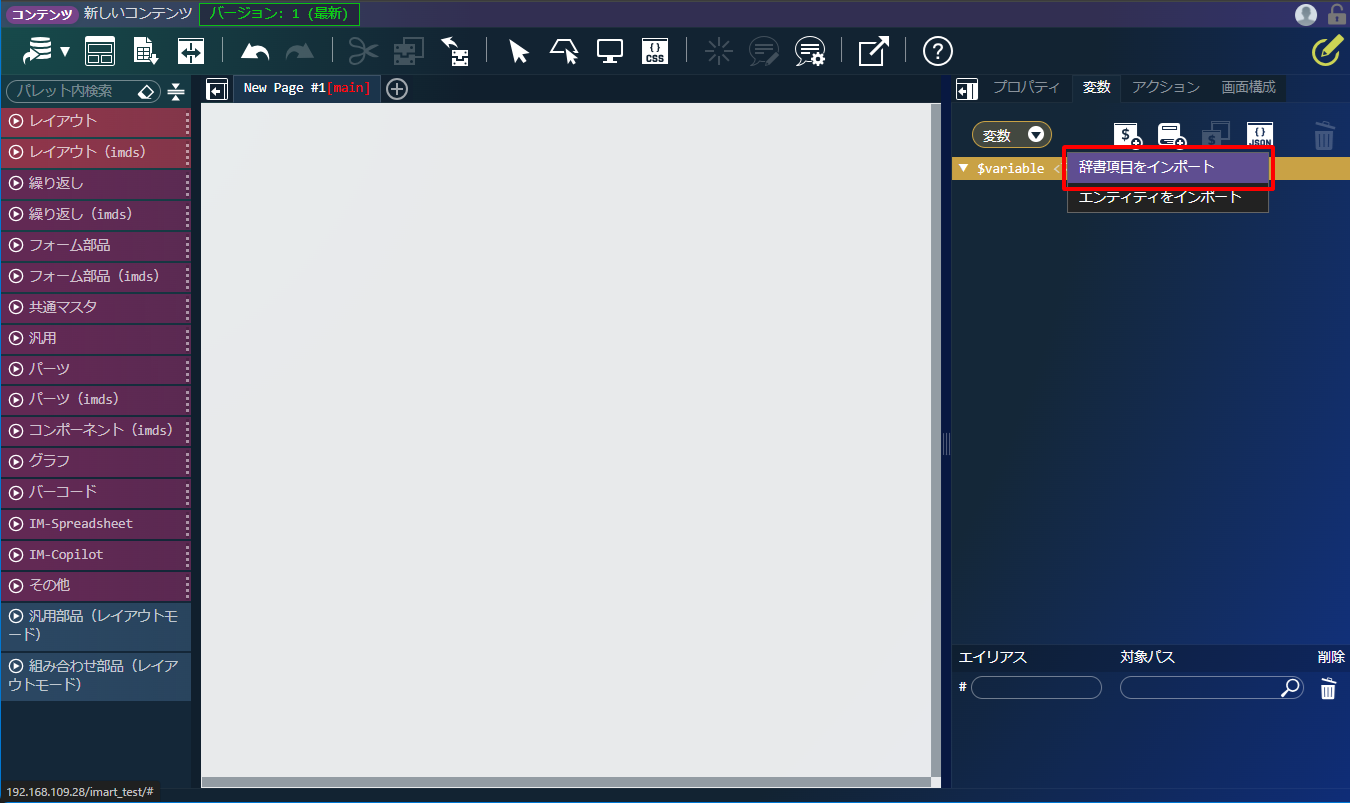 IM-Repository の定義から変数を作成する場合は、「サイトマップ」→「Repository」→「辞書項目一覧」または「列挙型一覧」であらかじめ定義を登録しておくことが必要です。