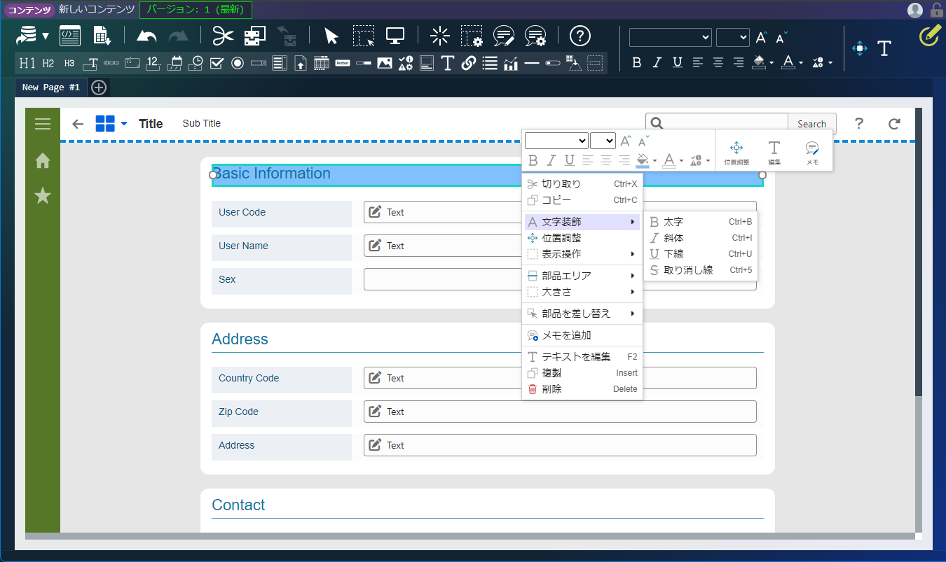 デベロップモードでは、見た目を調整したいときは画面の右側に表示されるプロパティタブを操作する必要があります。レイアウトモードでは、操作したい部品を右クリックすると、その場で現在使用可能な操作メニューが表示されます。また、画面右上には、よく使用する機能のショートカットアイコンが常時表示されています。デベロップモードと比べて、あえてレイアウトに関する機能のみに絞り込んでいるため、プロパティを操作するよりも、素早く、かつ、直感的に編集できます。