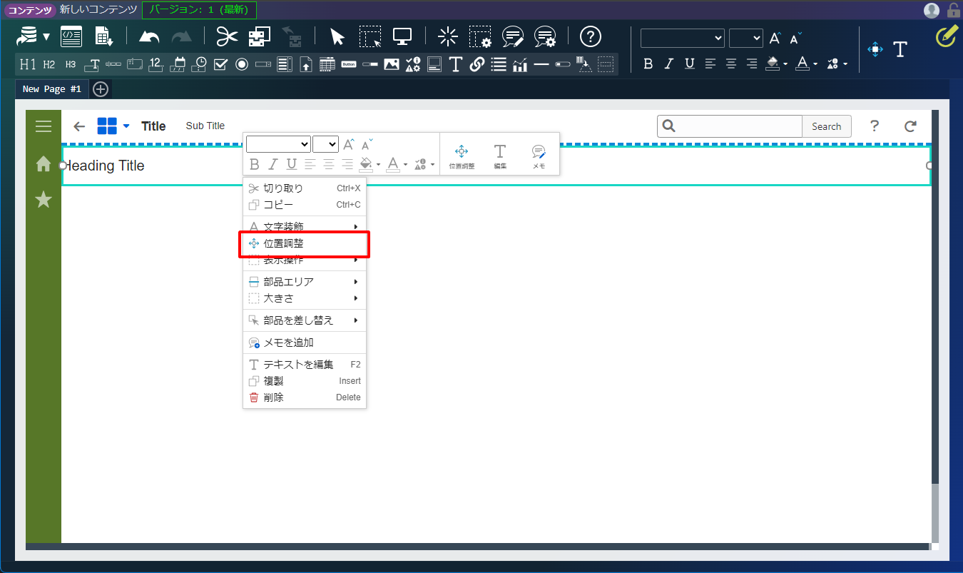 部品を右クリックし、ツールバーの「位置調整」をクリックする
