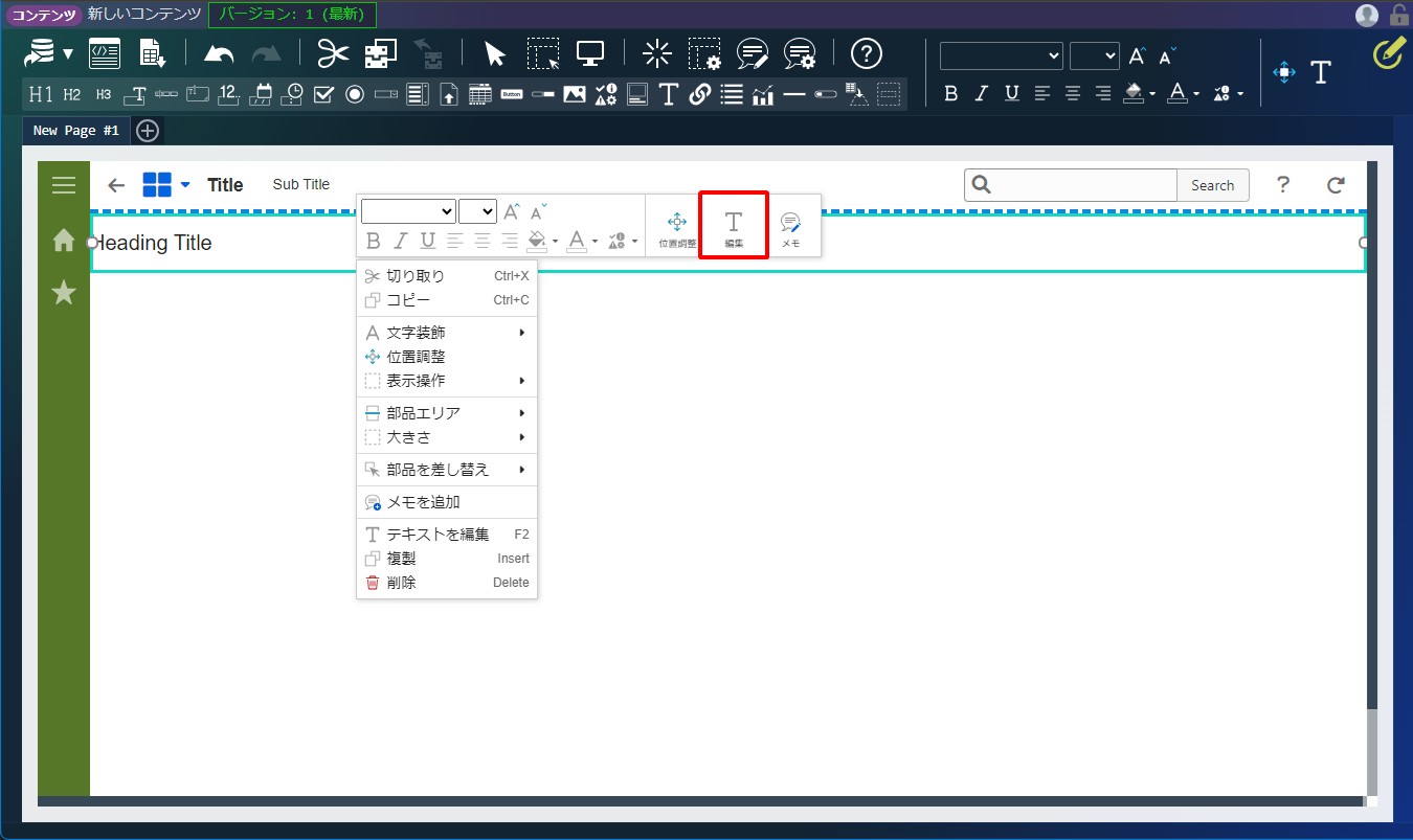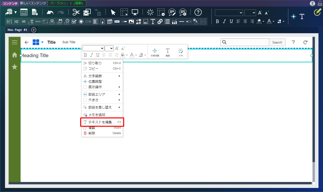 部品を右クリックすると、ツールバーと右クリックメニューが表示されます。ツールバーと右クリックメニューから部品を編集できます。ツールバーの詳細は「ツールバーから部品の見た目を調整する」を参照してください。右クリックメニューの詳細は「右クリックメニューで部品を操作する」を参照してください。
