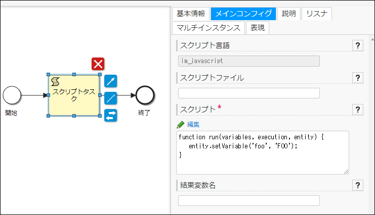 結果変数名の設定の詳細は「IM-BPM プロセスデザイナ 操作ガイド」 - 「スクリプトタスク」を参照してください。