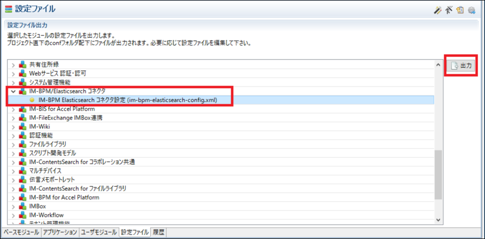 「IM-BPM/Elasticsearch コネクタ」モジュールの選択を行った後、「設定ファイル」タブより「IM-BPM/Elasticsearch コネクタ」→「IM-BPM/Elasticsearch コネクタ設定(im-bpm-elasticsearch-config.xml)」を選択し、右上の「出力」をクリックする。