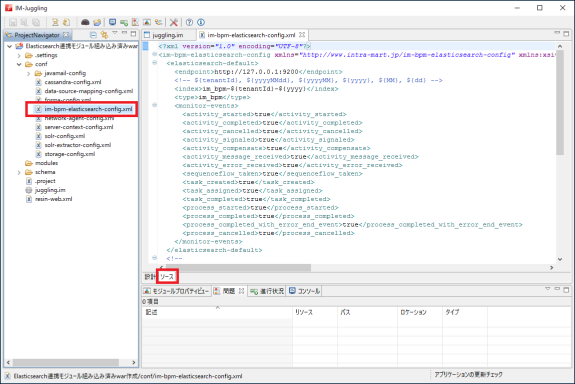 プロジェクト配下の<conf/>フォルダに生成された「im-bpm-elasticsearch-config.xml」をダブルクリックし、「ソース」タブをクリックし、「 IM-BPM Elasticsearch コネクタ設定 」を参照して修正し、保存する。