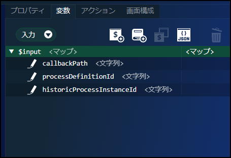 フォームの画面を開いた際、各アイテムの初期値として、指定されたMap型変数内のフィールド識別IDと同名のフィールドの値が利用されます。次の形式で指定します。inputVariableNames={入力変数名1},{入力変数名2}, ...入力結果の連携(resultVariableName)