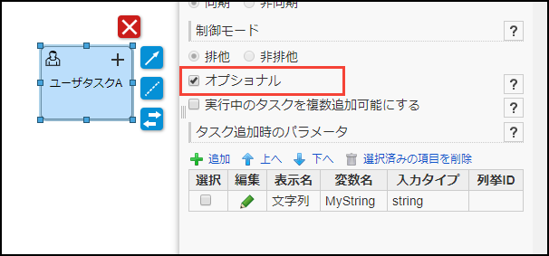プロセスデザイナで「オプショナル」設定をオンにしたフローエレメントは、オプショナルタスクとして扱われます。