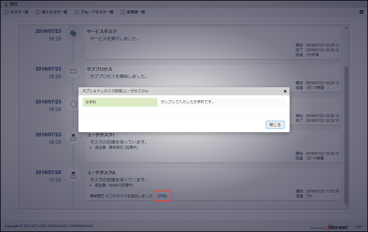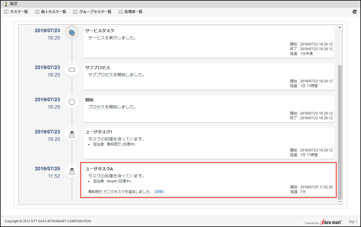 プロセスインスタンスに追加されたタスクは、プロセスインスタンスの履歴に時系列で表示されます。