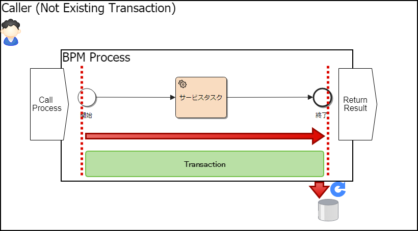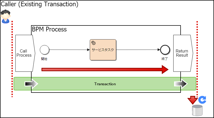 プロセスの処理時に、処理の呼び出し元(上図中ではCaller (Existing Transaction))が明示的にトランザクションを開始している場合には、そのトランザクションが継続して利用されます。