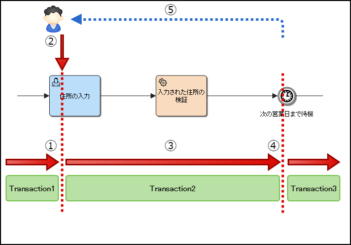 | 1 | 待機を伴うアクティビティ(ユーザタスク)に到達したため、トランザクション1が終了