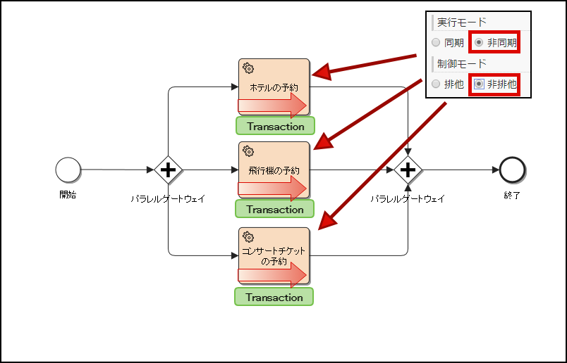 待機を伴うアクティビティに該当しないアクティビティでも、非同期実行オプションが設定されている場合、トランザクションの開始/終了の境界地点として扱われます。