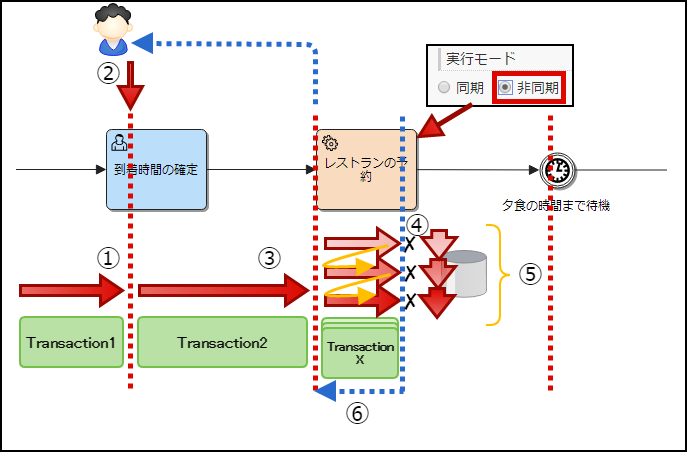 | 4 | 待機を伴うアクティビティ(タイマキャッチイベント)に到達したため、トランザクション2が終了