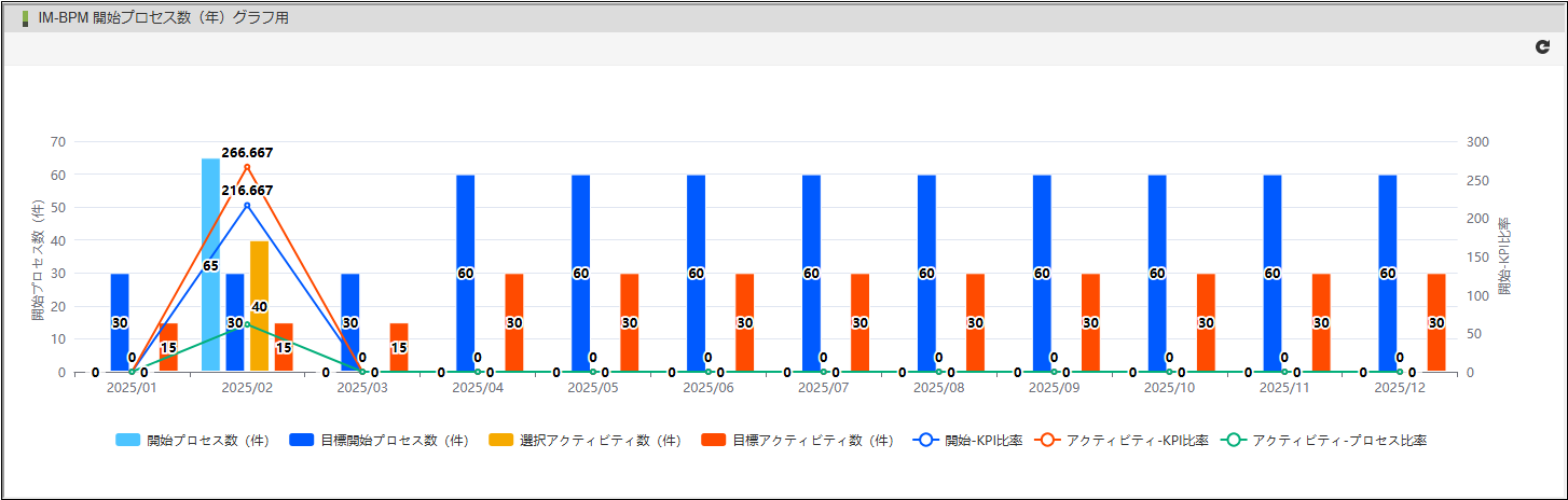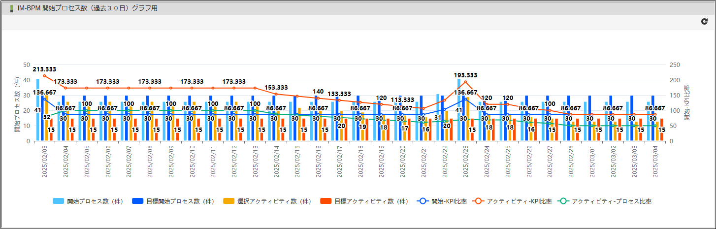 開始プロセス件数とKPI(目標開始プロセス件数)を棒グラフで表示します。 選択アクティビティ件数とKPI(目標開始アクティビティ件数)を棒グラフで表示します。 アクティビティ件数は、パラメータとしてactivityIdを指定した場合のみ表示します。 開始-KPI比率(開始プロセス件数 ÷ KPI(目標開始プロセス件数))を線グラフで表示します。 アクティビティ-KPI比率(開始アクティビティ件数 ÷ KPI(目標開始アクティビティ件数))を線グラフで表示します。 アクティビティ-プロセス比率(開始アクティビティ件数 ÷ 開始プロセス件数)を線グラフで表示します。コラム