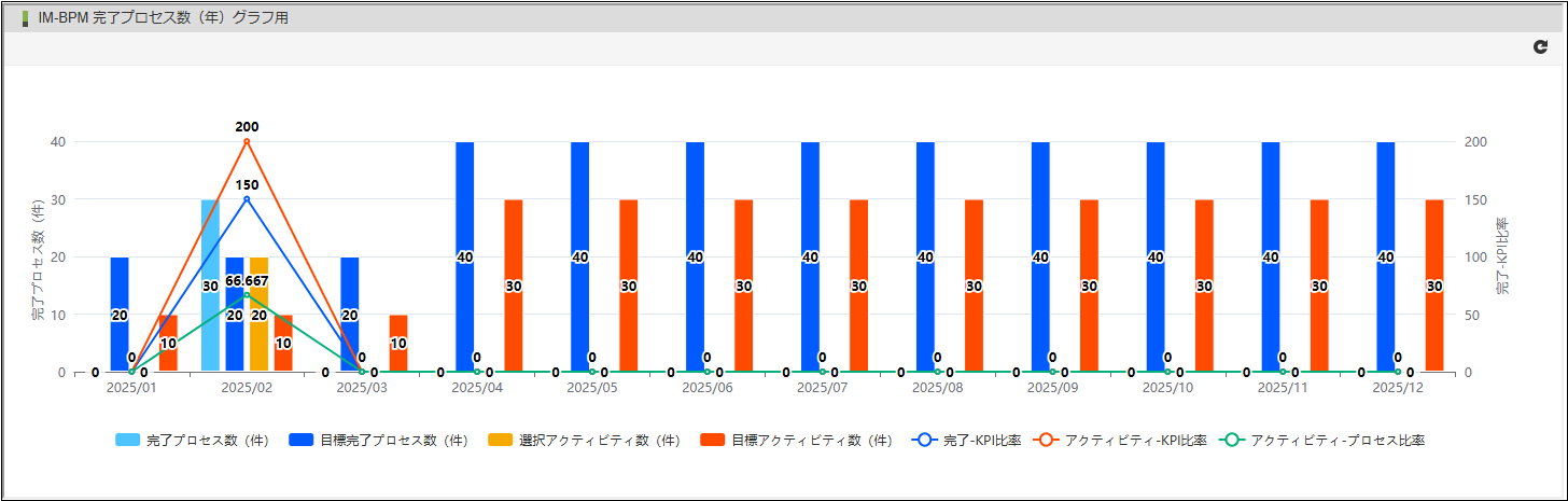 各グラフのKPIはim_act_kpi_settingのデータを参照しています。im_act_kpi_settingテーブルのデータは、プロセスモニタのKPI設定モーダルより登録できます。KPI設定については、「IM-BPM ユーザ操作ガイド」 - 「KPI設定モーダルを表示する」を参照してください。