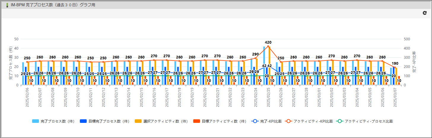 完了プロセス件数とKPI(目標完了プロセス件数)を棒グラフで表示します。 選択アクティビティ件数とKPI(目標完了アクティビティ件数)を棒グラフで表示します。 アクティビティ件数は、パラメータとしてactivityIdを指定した場合のみ表示します。 完了-KPI比率(完了プロセス件数 ÷ KPI(目標完了プロセス件数))を線グラフで表示します。 アクティビティ-KPI比率(完了アクティビティ件数 ÷ KPI(目標完了アクティビティ件数))を線グラフで表示します。 アクティビティ-プロセス比率(完了アクティビティ件数 ÷ 開始プロセス件数)を線グラフで表示します。コラム