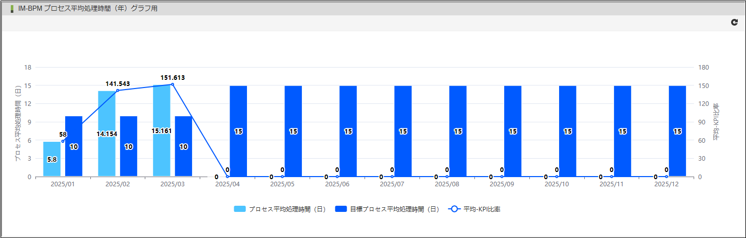 平均処理時間は”日”単位の四捨五入、小数点第三位まで表示します。平均処理時間の算出対象は完了プロセスのみで、実行中のプロセスは含まれません。グラフの縦軸(左)には平均処理時間(棒グラフの目盛り)、縦軸(右)には比率(折れ線グラフの目盛り、単位は%)、横軸には指定年の1~12月を表示します。軸名には凡例の一つが反映されます。