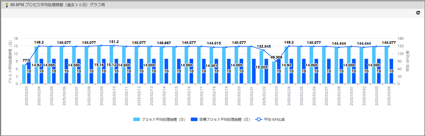 平均処理時間は”日”単位の四捨五入、小数点第三位まで表示します。平均処理時間の算出対象は完了プロセスのみで、実行中のプロセスは含まれません。グラフの縦軸(左)には平均処理時間(棒グラフの目盛り)、縦軸(右)には比率(折れ線グラフの目盛り、単位は%)、横軸には過去30日の日付を表示します。軸名には凡例の一つが反映されます。
