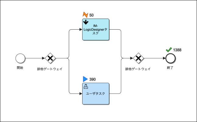 開始済みのプロセスインスタンス一つの実行情報が表示されるプロセス図です。
