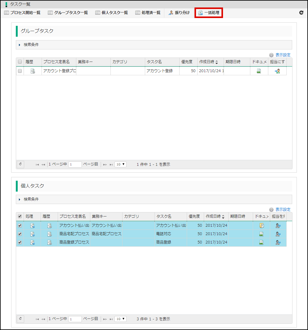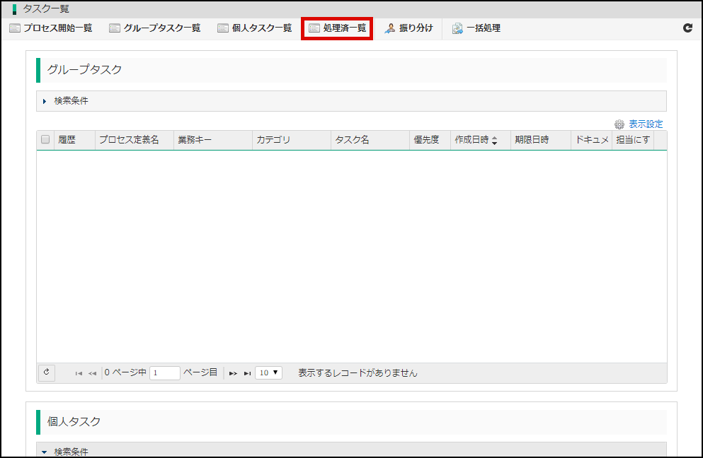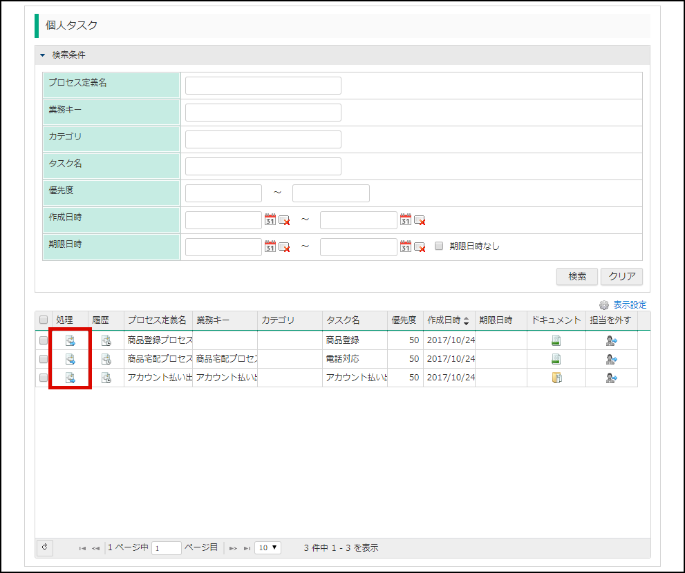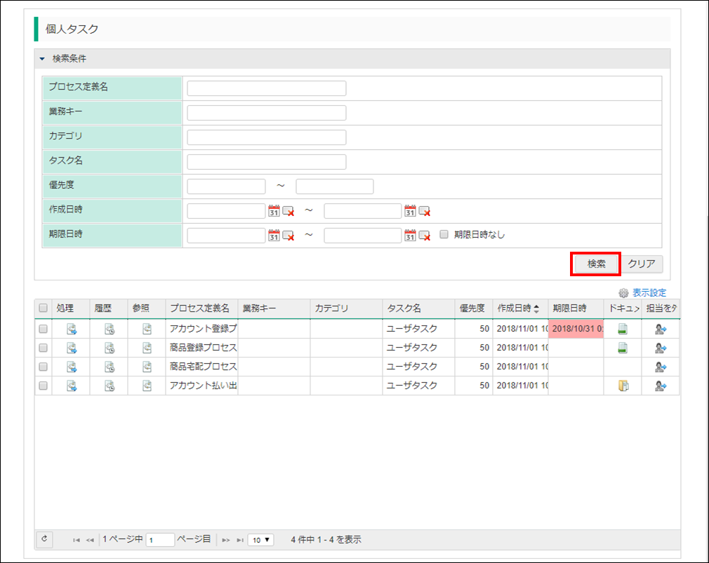 ※ この列は「IM-BPM プロセス参照ユーザ」、または、「IM-BPM管理者」のロールが付与されたユーザでのみ表示されます。- プロセス定義名 プロセス定義名が表示されます。 部分一致 業務キー 業務キーが表示されます。 部分一致 カテゴリ カテゴリが表示されます。 完全一致 タスク名 タスク名が表示されます。 部分一致 優先度 優先度が表示されます。 範囲 開始日時 ユーザタスクの作成日時が表示されます。 範囲 期限日時 ユーザタスクの期限日時が表示されます。期限日時を超過している場合、期限日時が装飾されて表示されます。 期限日時なしが選択されている場合、期限日時が設定されていないタスクのみ検索します。期限日時なしが選択されている場合、期限日時の設定は反映されません。範囲担当日時 ユーザタスクの担当になった日時が表示されます。再度担当を振りなおすと、振りなおした時点の日時が表示されます。- 終了日時 ユーザタスクの終了日時が表示されます。 範囲