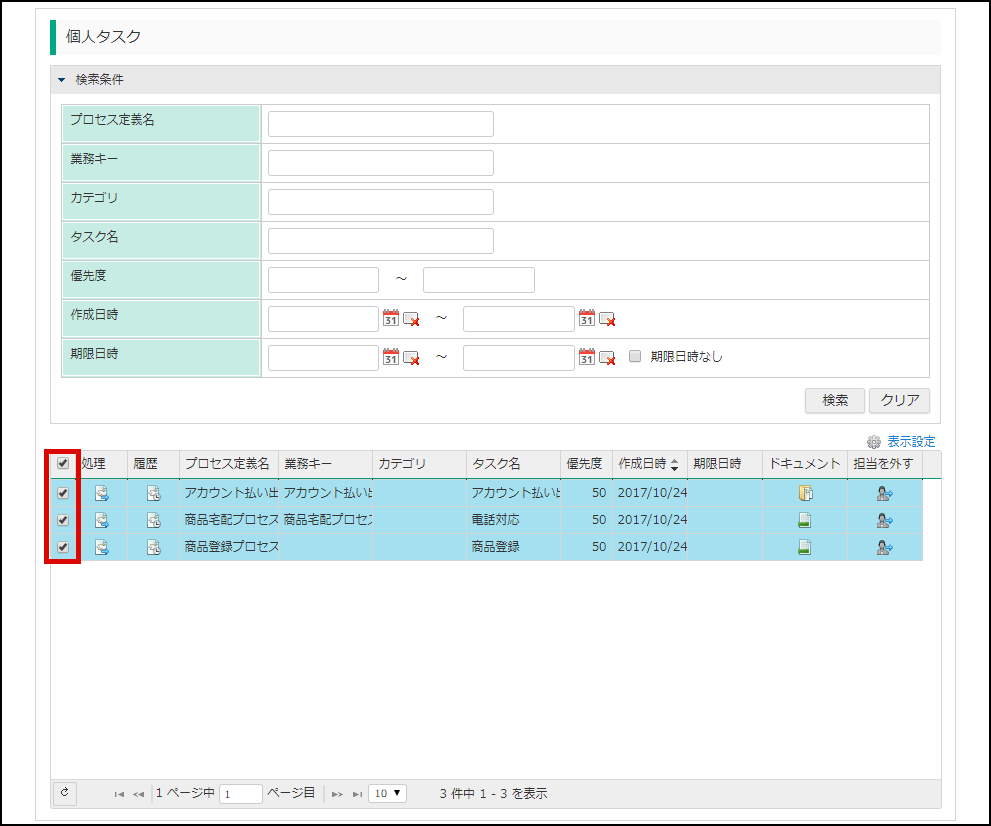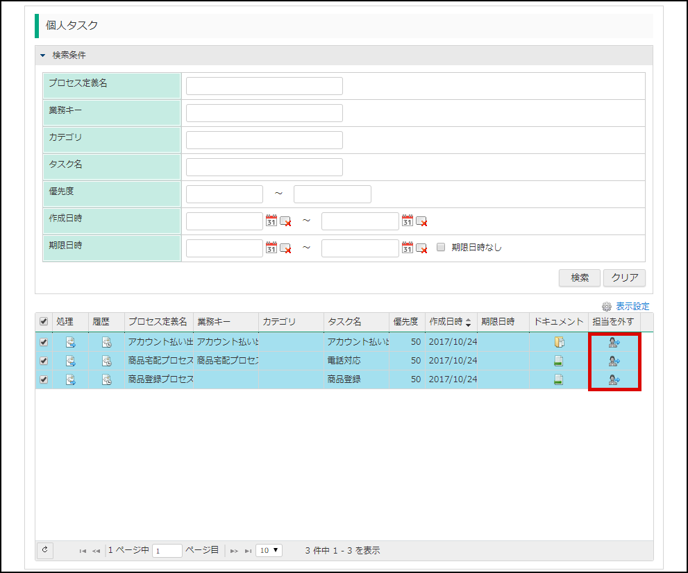 ※ この列は「IM-BPM プロセス参照ユーザ」、または、「IM-BPM管理者」のロールが付与されたユーザでのみ表示されます。- プロセス定義名 プロセス定義名が表示されます。 部分一致 業務キー 業務キーが表示されます。 部分一致 カテゴリ カテゴリが表示されます。 完全一致 タスク名 タスク名が表示されます。 部分一致 優先度 優先度が表示されます。 範囲 作成日時 ユーザタスクの作成日時が表示されます。 範囲 期限日時 ユーザタスクの期限日時が表示されます。期限日時を超過している場合、期限日時が装飾されて表示されます。 期限日時なしが選択されている場合、期限日時が設定されていないタスクのみ検索します。期限日時なしが選択されている場合、期限日時の設定は反映されません。範囲ドキュメント プロセス定義および、ユーザタスクのドキュメントが表示されます。 - 担当を外す を押下すると、自分から担当を外します。