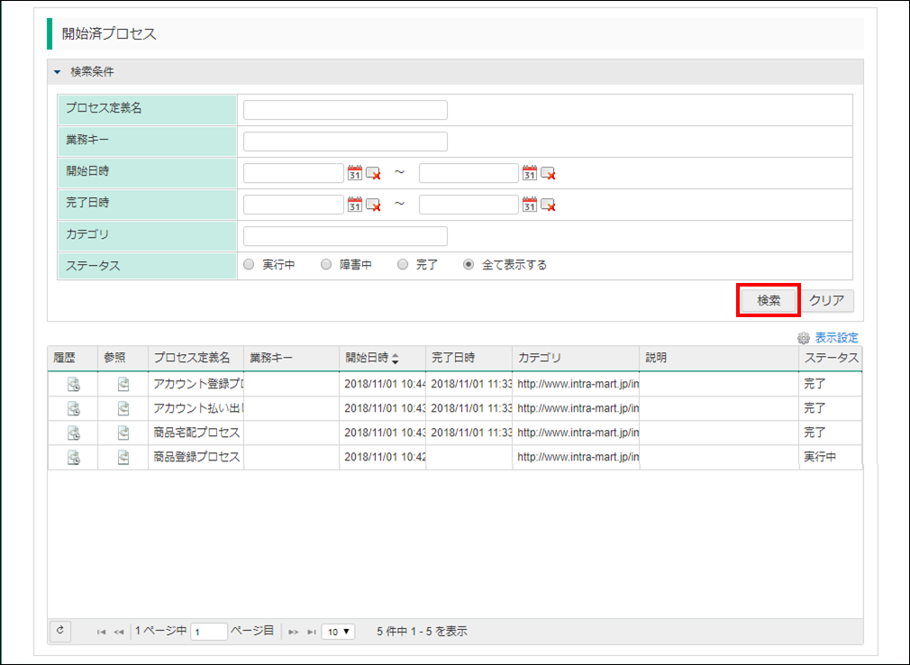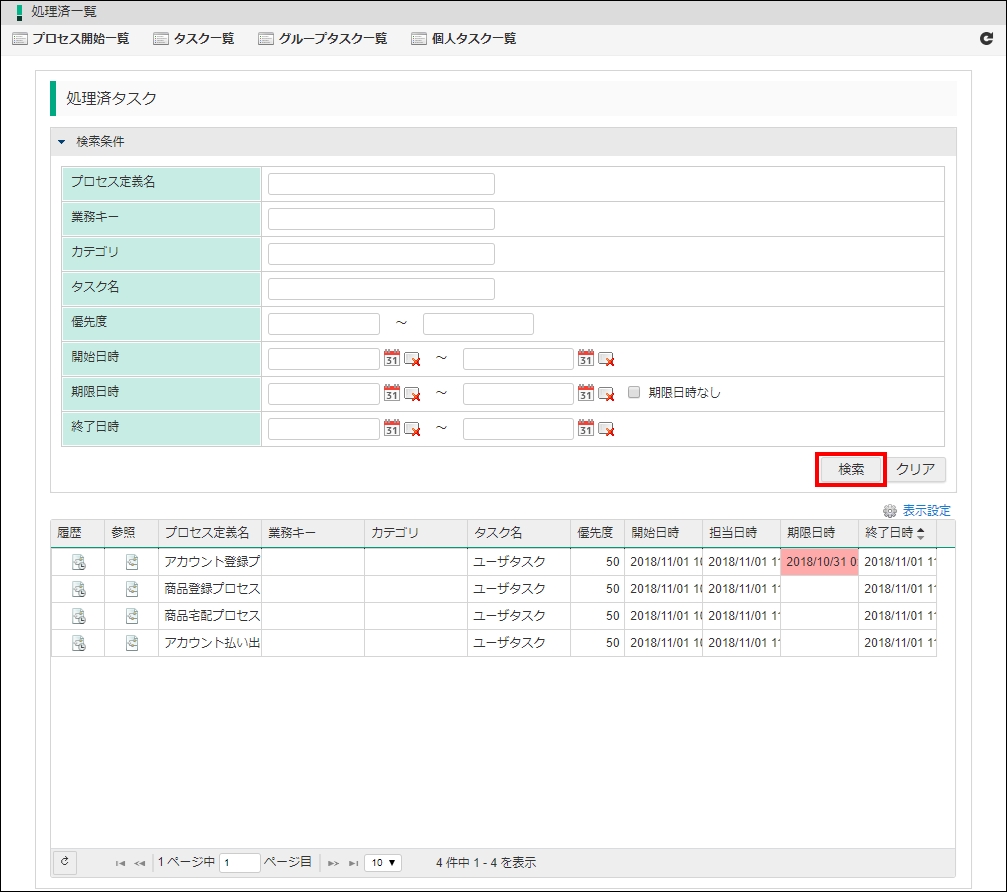 項目名 説明 検索条件 履歴 を押下すると、プロセスインスタンスの履歴画面へ遷移します。