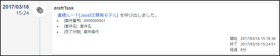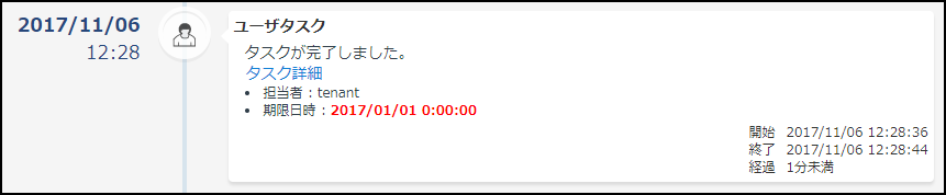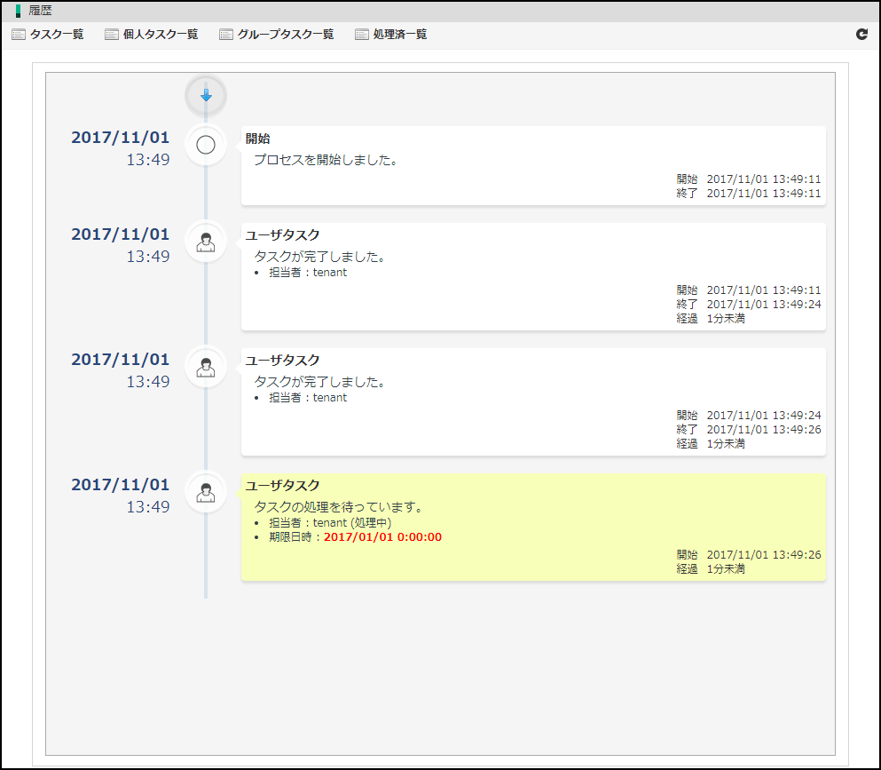 項目名 説明 検索条件 処理 ユーザタスクに画面が設定されている場合は、該当する画面に遷移します。画面が設定されていない場合は、そのままユーザタスクが完了され、次のアクティビティに遷移します。- 履歴 を押下すると、プロセスインスタンスの履歴画面へ遷移します。