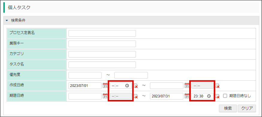 IM-BPM for Accel Platform 2023 Autumn(Hollyhock) より日時検索条件に時刻入力欄が利用できます。