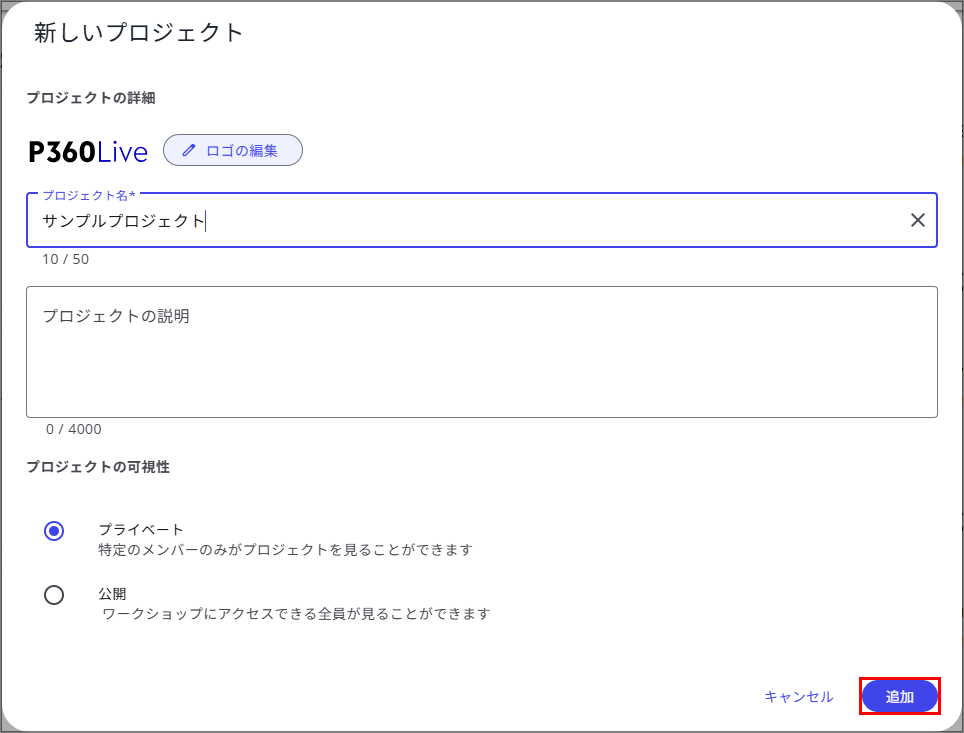 - プロジェクトの情報を入力して「追加」ボタンをクリックします。