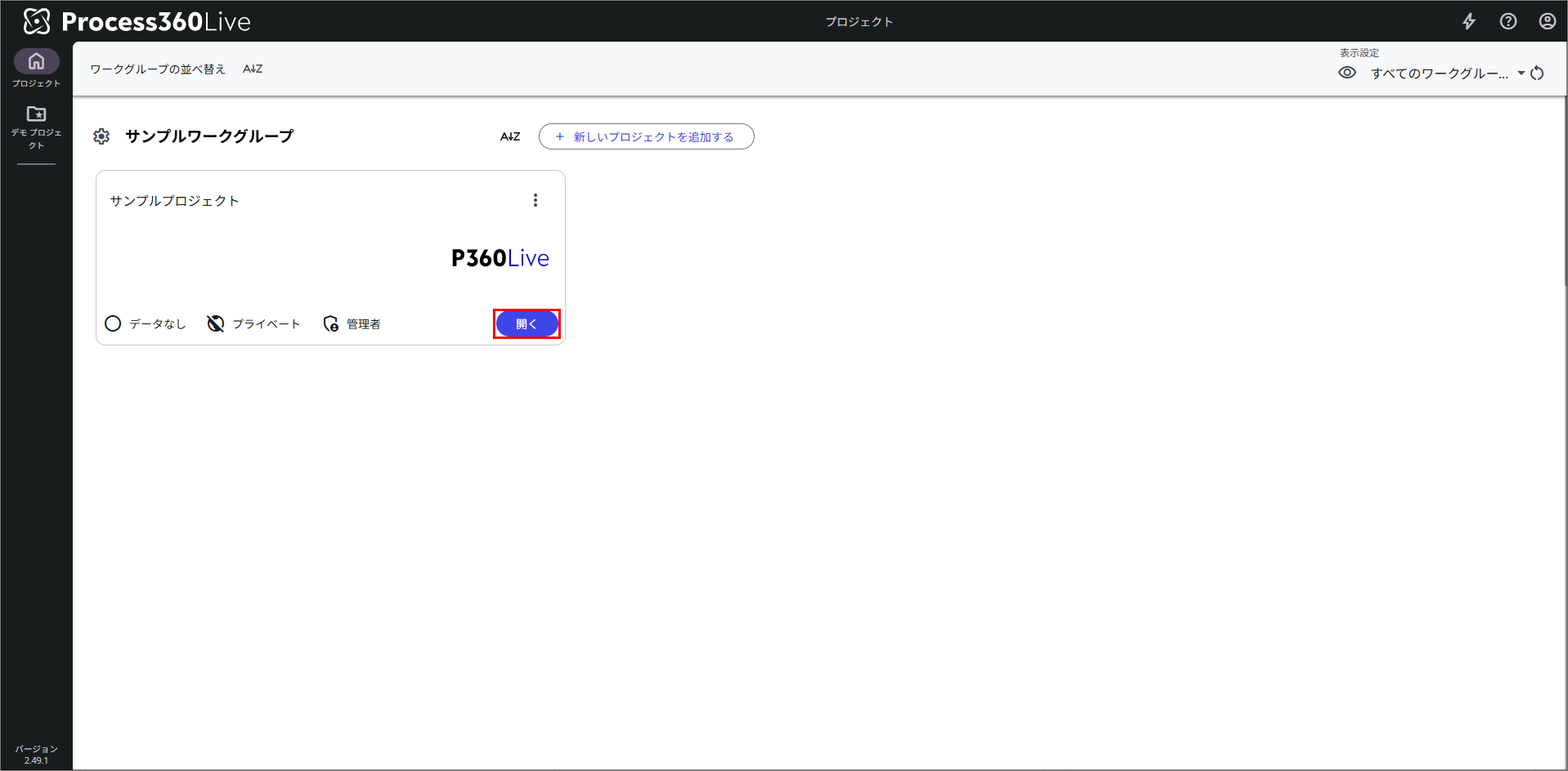 - 「プロジェクト一覧」画面で追加したプロジェクトの「開く」ボタンをクリックします。