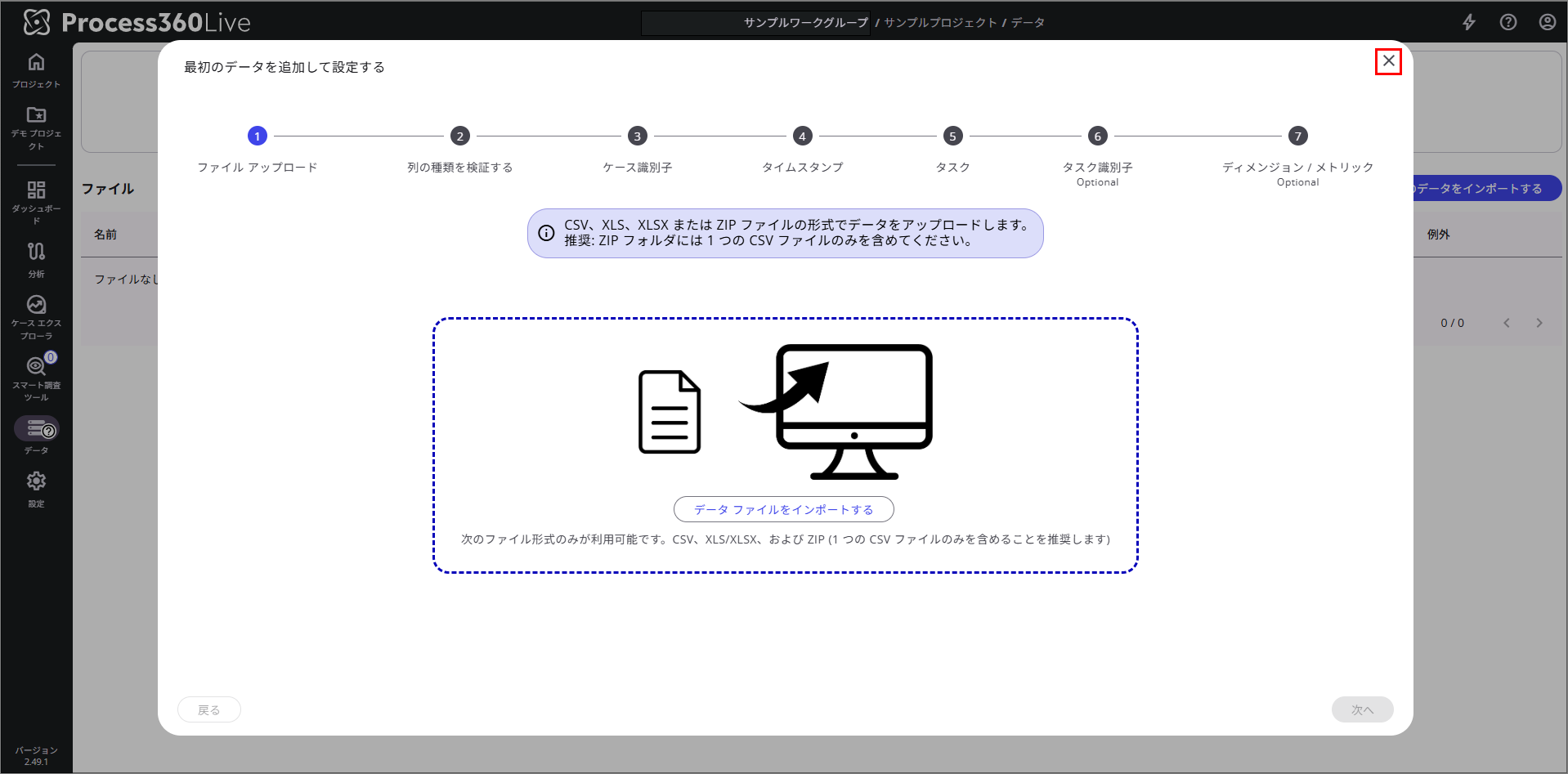 - 「最初のデータを追加して設定する」ダイアログの「✖」アイコンをクリックして閉じます。